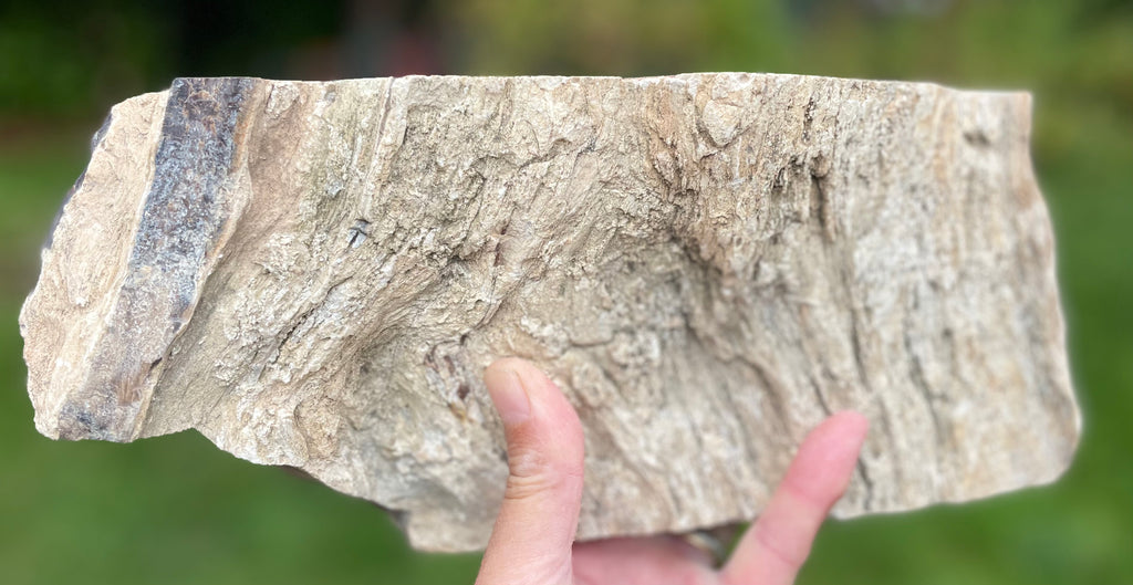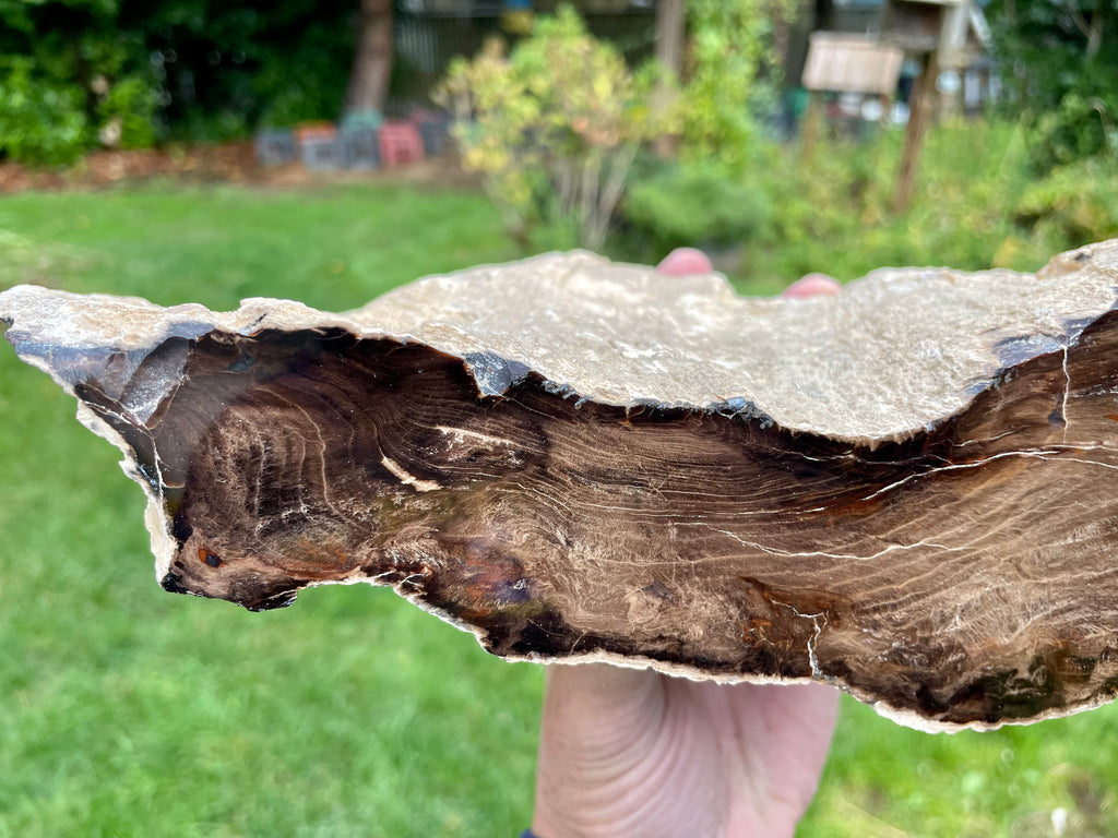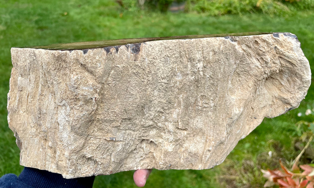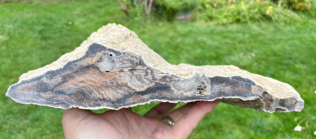 This is a large specimen of petrified wood it has rich reds and browns showing the beautiful grain of this cut and polished piece of fossilized wood that grew long ago. It has a light brown outer shell and is deep with a flat bottom that is sits on. It weights nearly 5-1/2 lbs and is approximately 10” long, 3-1/3” at its widest point and is nearly 5” deep.