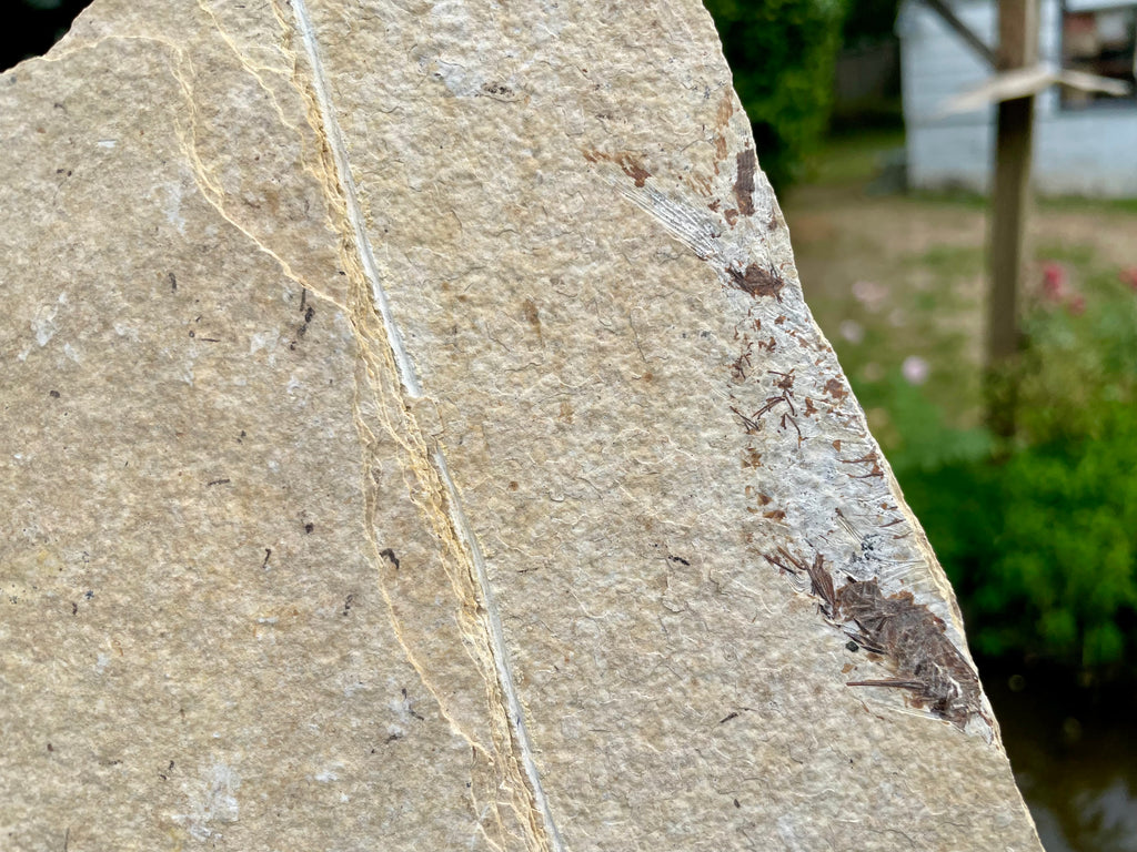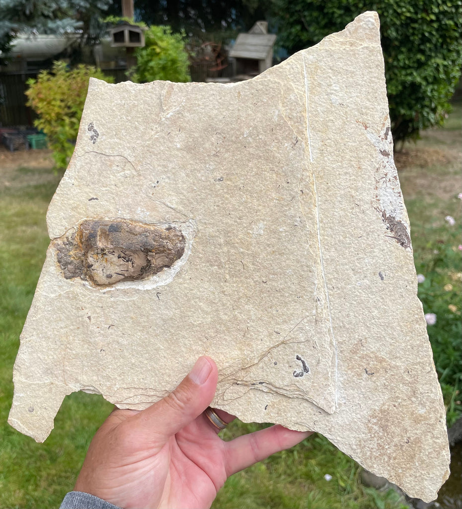 This is a large well preserved piece of Coprolite (fossil poop) that is likely from a crocodile I found in the mid level split fish layer of fossil lake it has detailed bone preservation that is very dark reddish brown. This specimen has part of its side missing allowing us to see the details of the fish bones of a recent meal. It is 3” long with great details shown in the very dark red/brown color and includes a bonus partial fish fossil and some fish Coprolite. It is on a piece of naturally shaped lake bottom silt stone that is approximately 9” x 11”