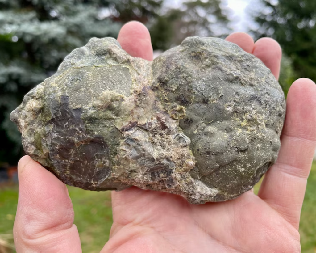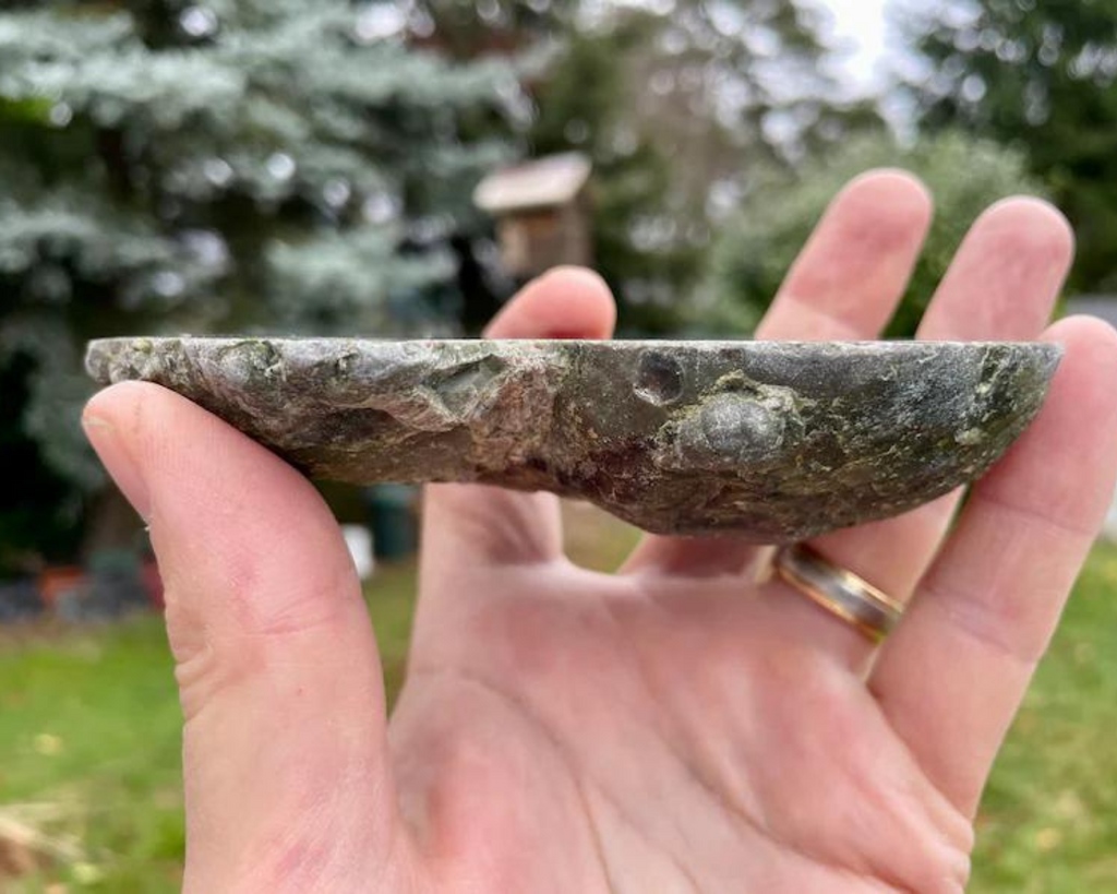 This beautiful double half of a black Dome thunder egg is from British Columbia, Canada. These are hard to acquire and are in short supply but are distinctive and unique with their dark green shell that is hard and gives a nice polish along with the beautiful core. This one has a solid core of dark agate with lighter colored waterlines. It is fully polished and is approximately 4-1/2” x 3” and is a thin cap cut.