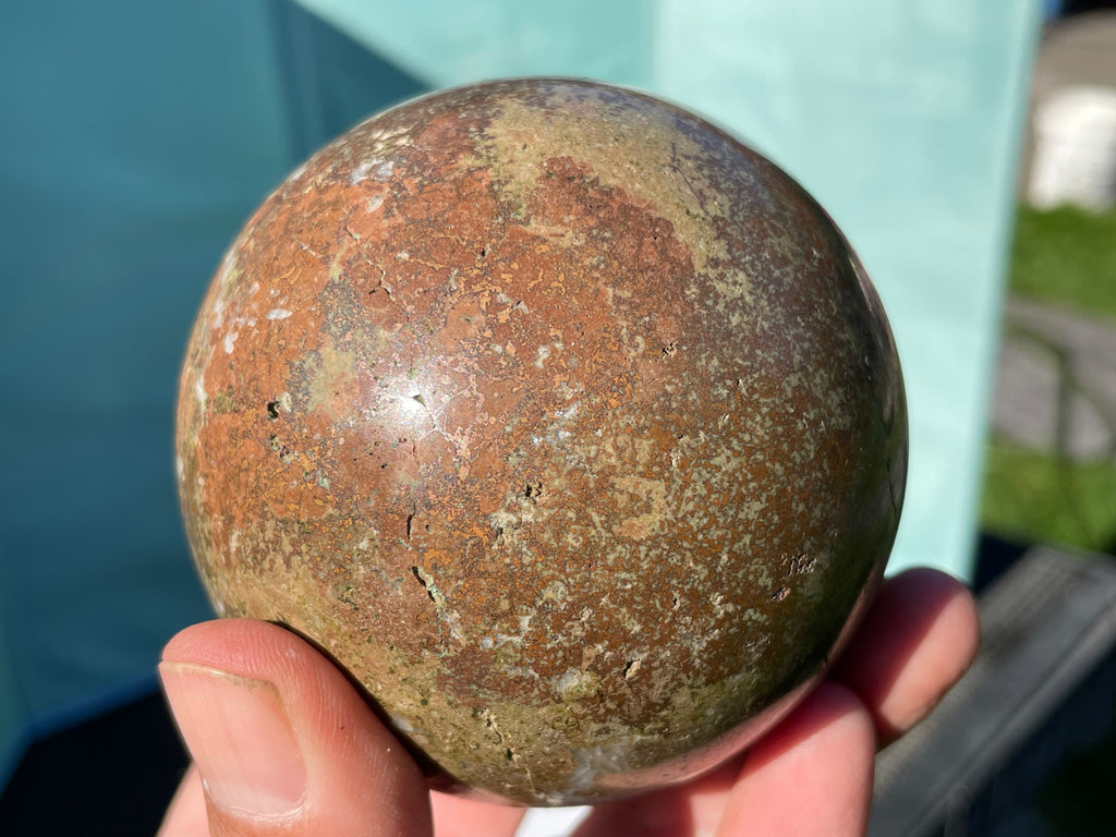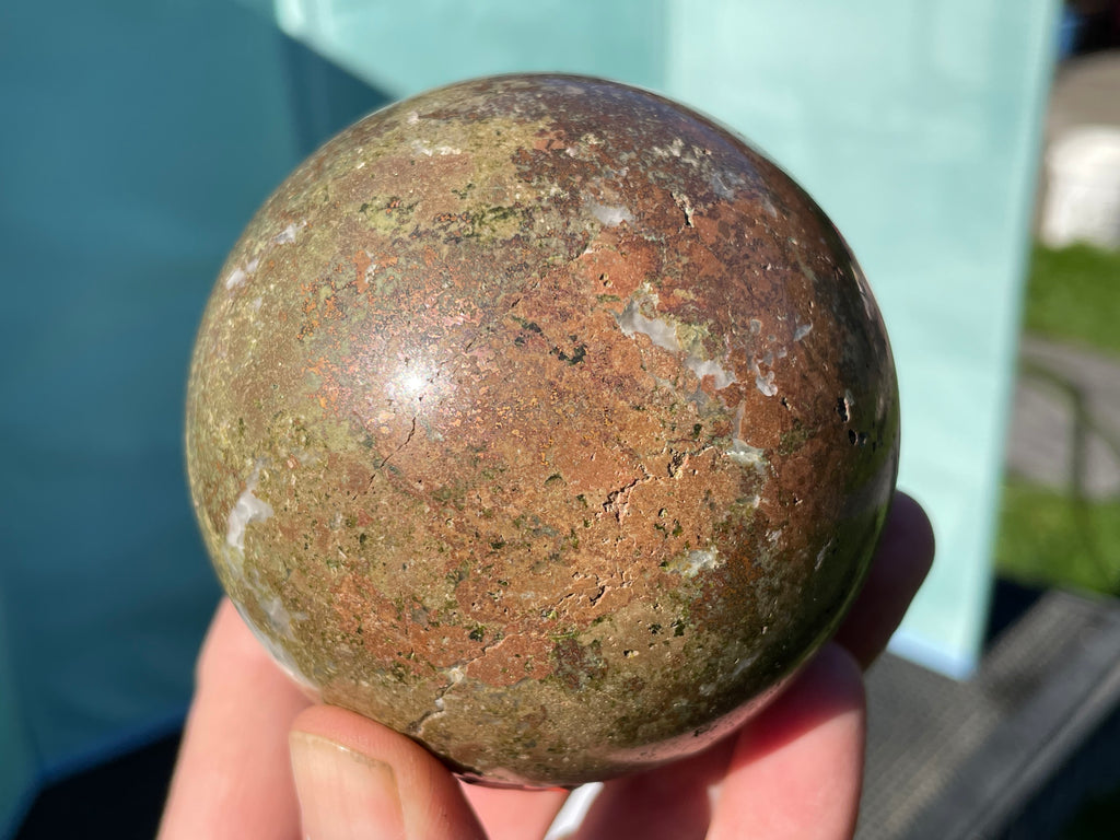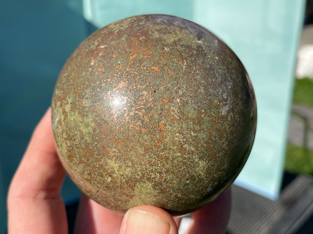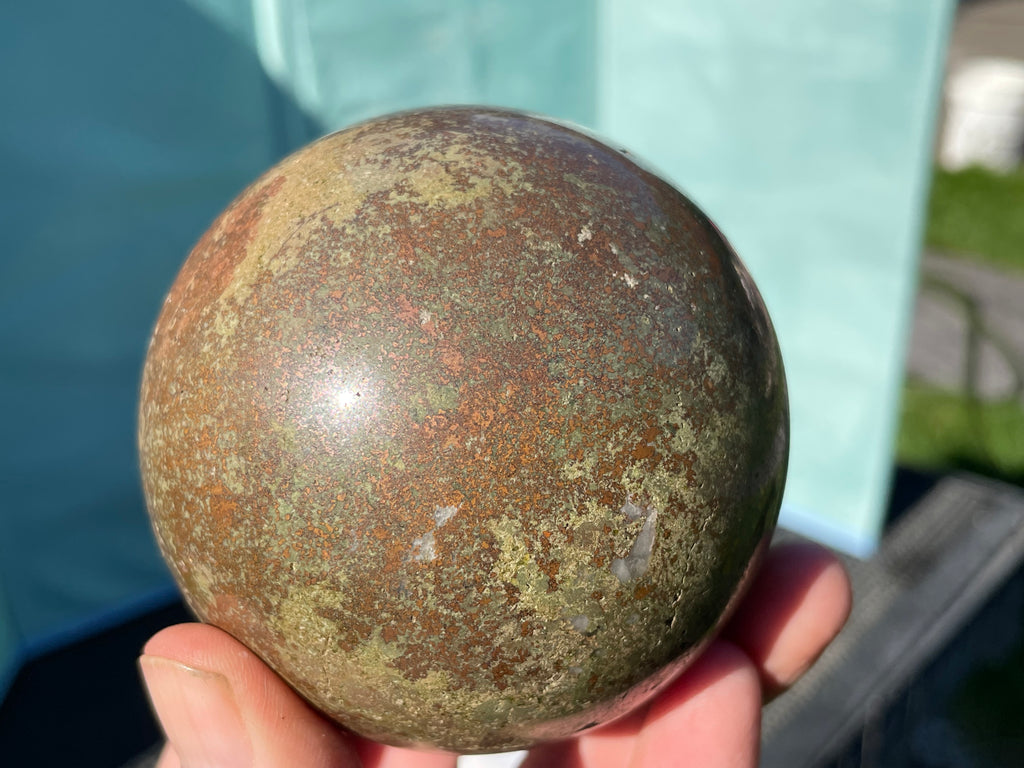 This is a stone sphere made in Oregon from material found in Alaska. This sphere is copper in matrix and is very heavy for its size and very unique.