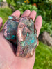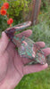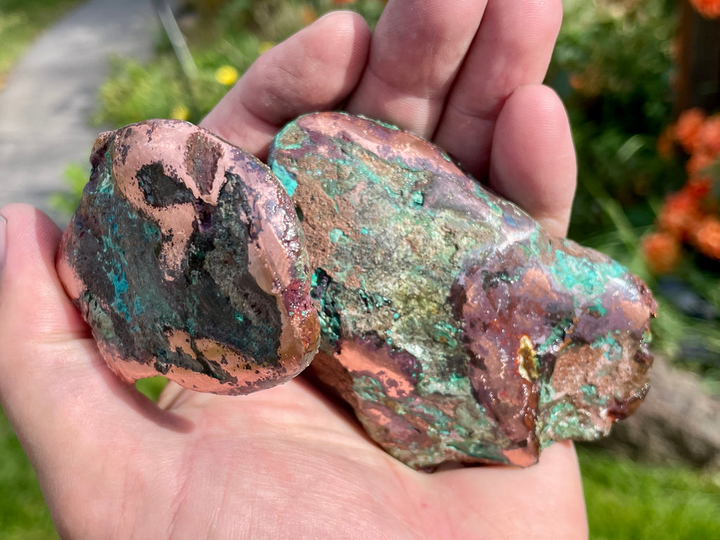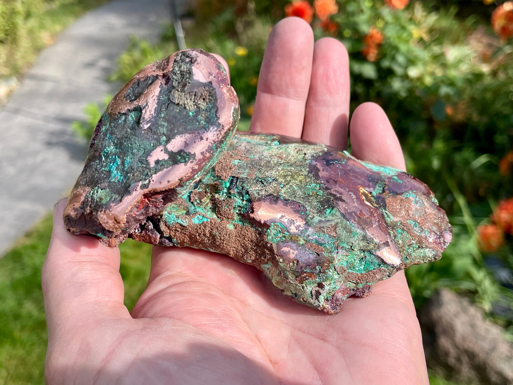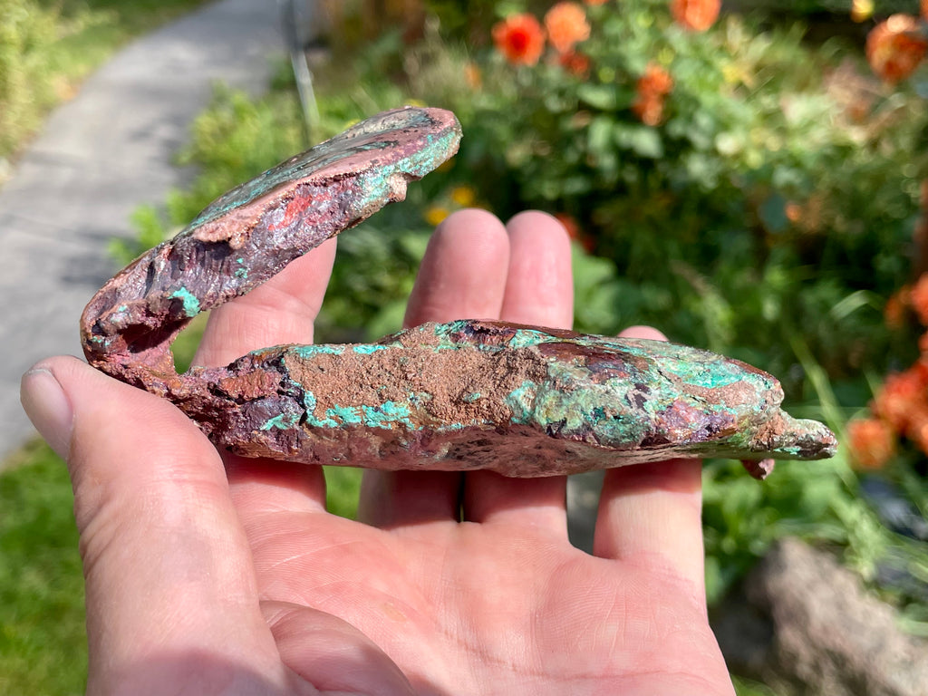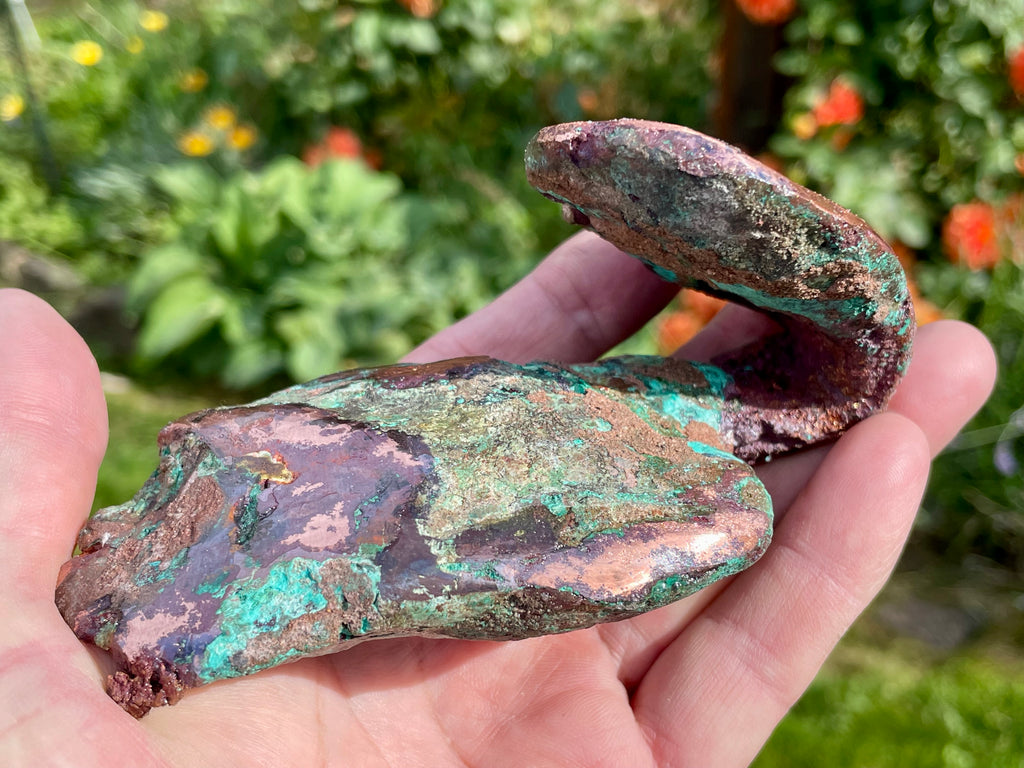 This is a very unique piece of float copper from the Michigan area. Float was removed from the host rock by the glaciers during the ice age and then was in the ground in its new location until found with a metal detector and dug up. This one has also been bent by the massive forces put on it giving it a very unique look. I have window polished it to show the copper under the layers of oxidation minerals preserving beautiful green and purple patina and then coated the copper to keep it from tarnishing.
