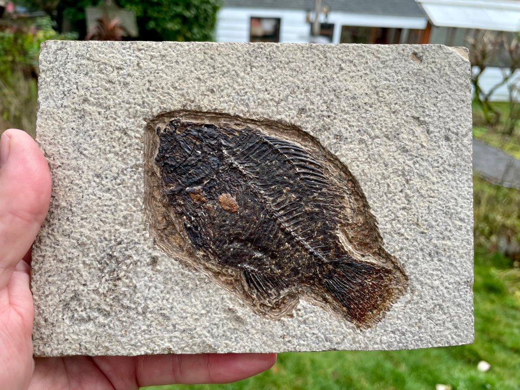 This is a nice 4-1/2” Cockerellites (Priscacara) Liops this one has its upper fin standing mostly upright showing off the detail in the long fin rays and is on a piece of lake bottom siltstone that is 6-3/4” x 4-3/4” and it has been sealed for display. It is from the sought after 18” layer of The Green River Formation in Wyoming. The fish in this layer are very dark and have a robust preservation with excellent detail. They are nearly always found covered in stone and have to be carefully uncovered during the preparation work. This piece is designed to be placed in a stand but can be backed in plywood and a hanging wire added on request.