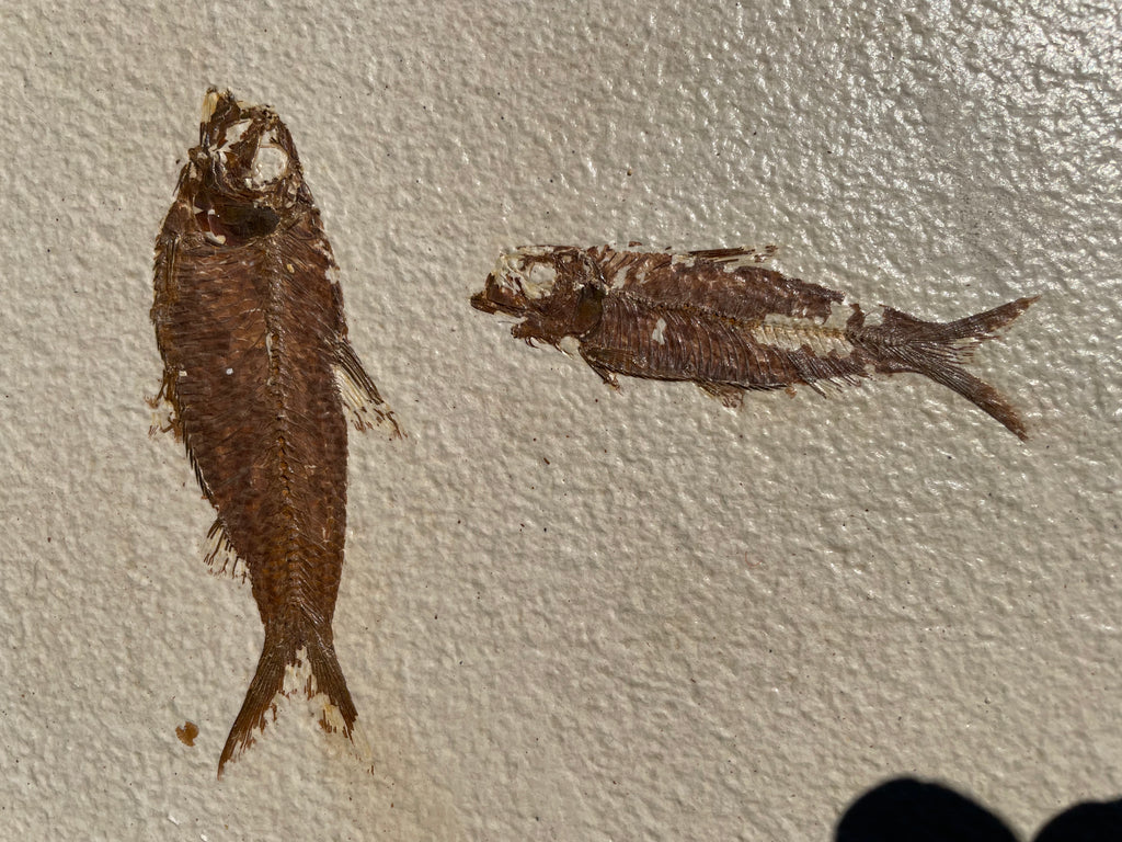 These fish are by and large the most abundant and prolific fish from the Green River Formation. They are related to modern herring, and average between 3 and 5 inches with a maximum size of 10 inches. Knightia was apt to school throughout its life in the pursuit of its favorite food, plankton. There are two recognized species of Knightia, K. eoceana and K. alta. K. eocana is the more common of the two and is substantially more abundant in Fossil Lake deposits. Mass mortality plates have produced significant evidence of the enormity of school sizes for Knightia species, with a few large plates averaging 100 fish per square meter and overall they represent about 50% of the fossil fish found in the formation.