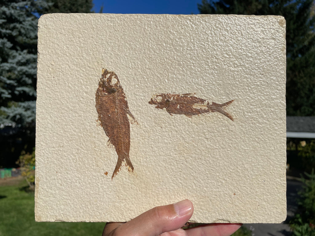 This is a large plate that contains 2 exceptionally preserved Knightia eoceana with skin seen covering the bone structure preserved in a deep reddish brown. I extracted this one from the 12” or split fish layer of fossil lake. This plate is approximately 9” x 7-1/2” x 1/2” and the fish are over 4” and 3” respectively. Shipping and packaging is included in the price.