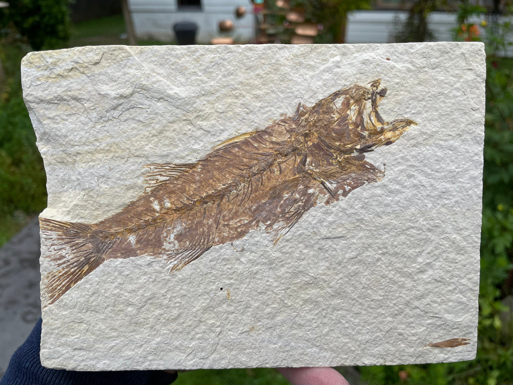 This is a medium sized Mioplosus from the Green River formation in Wyoming that is well preserved, even showing scale details. They were solitary hunters with larger specimens showing needle like teeth and some with a fish lodged in their mouth at death known as an aspiration. They are distinguished by their double dorsal fins and fan like tail. This area was part of the. Now famous Fossil Lake during the Eocene period and is from the split fish or 12” layers that have more of a brown/red color. This specimen is approximately 6” long on a nice piece of matrix that is approximately 7”x5” and is 1/2” thick. This fish has fresh water relatives in the present day Northern Hemisphere, Asia, Europe and New Zealand. Shipping and packaging is included in the price.