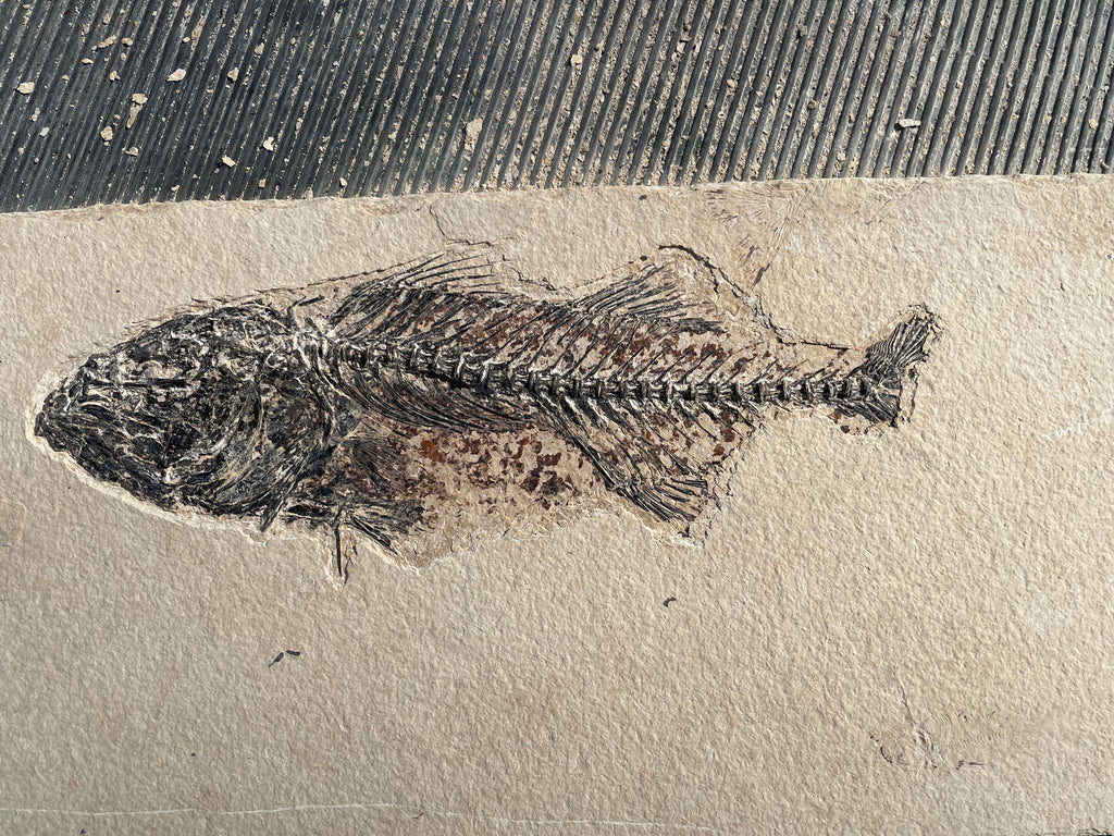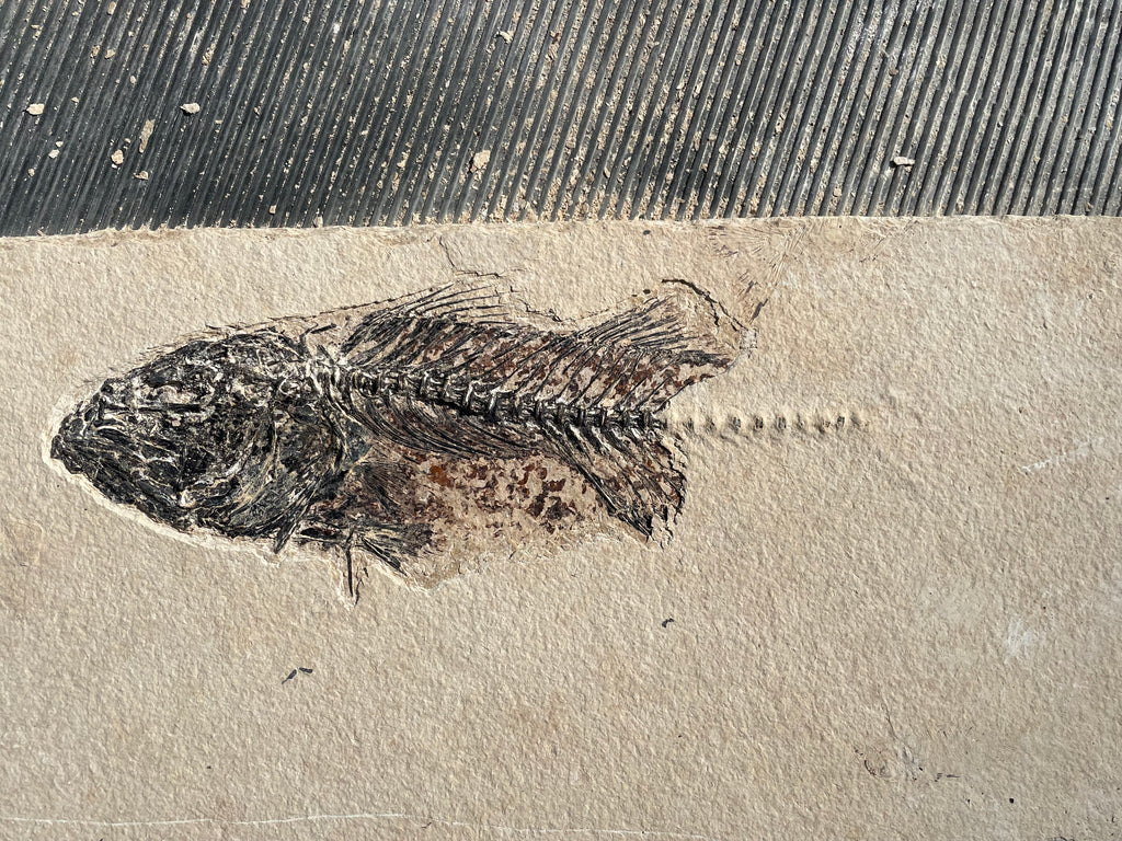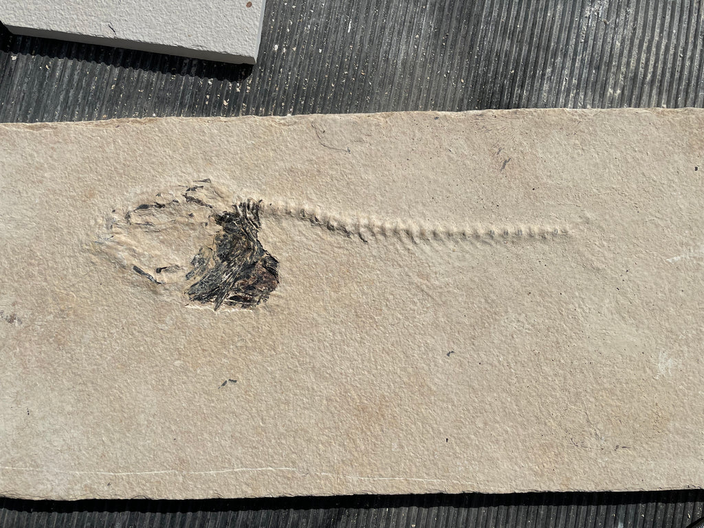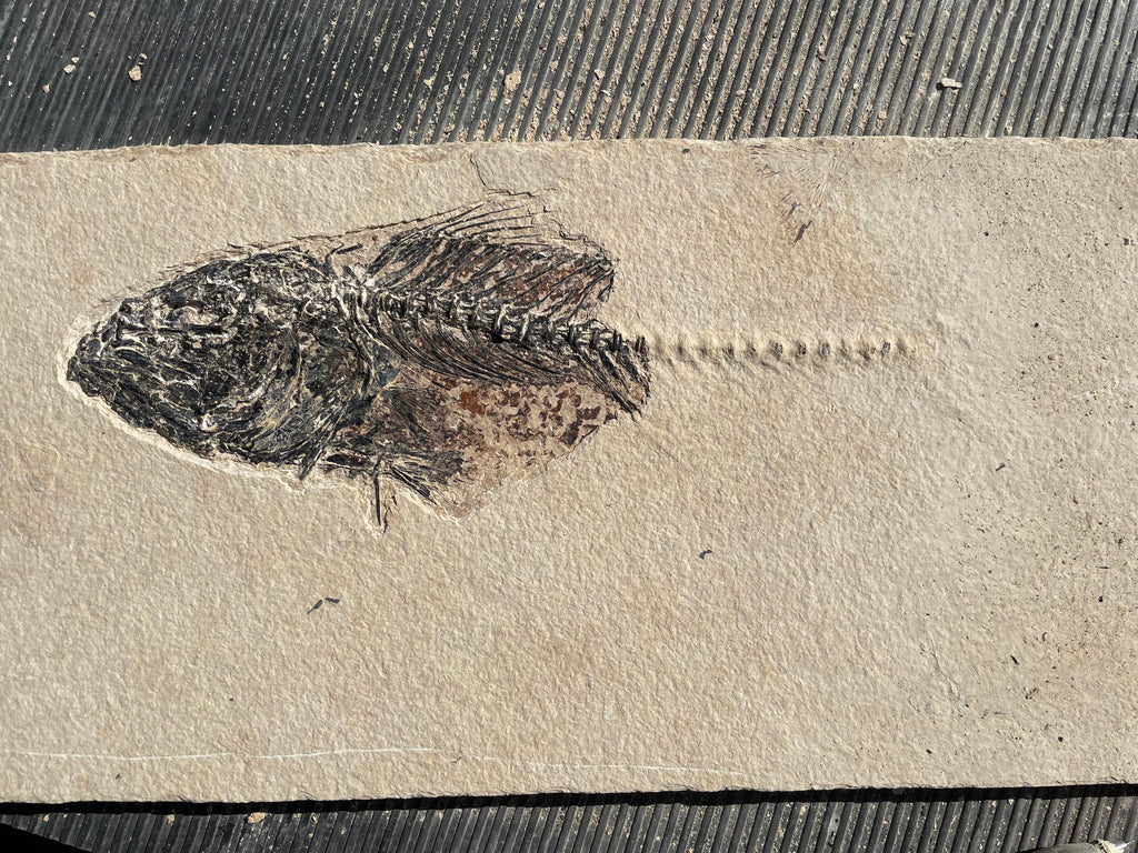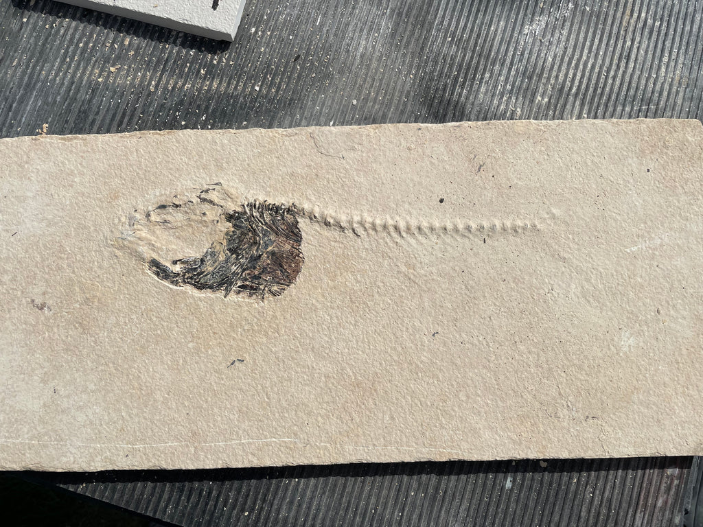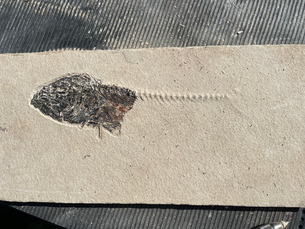 This is a large Mioplosus from the Green River formation in Wyoming that is very well preserved showing great details with the bony head, spine and fin structure being the best preserved and has a closed jaw. They were solitary hunters with larger specimens showing needle like teeth and some with a fish lodged in their mouth at death known as an aspiration. They are distinguished by their double dorsal fins and fan like tail. This area was part of the. Now famous Fossil Lake during the Eocene period and is from the split fish layers that are not near shore but mid depth in the lake that have a dark brown/red color a robust bone definition. The tail is incomplete and that is reflected in the price of this fantastic specimen. When found this specimen was completed covered in the lake bottom silt stone as is common in this layer on the larger fish. Photos of the preparation work I did in uncovering this beautiful fish are included. This specimen is approximately 13” long on a nice piece of matrix that is approximately 21”x 9” and is 1/2” thick and has been backed in plywood making it strong and easy to hang on a wall is desired. This fish has fresh water relatives in the present day Northern Hemisphere, Asia, Europe and New Zealand.