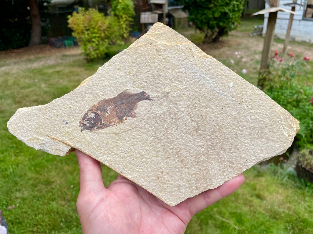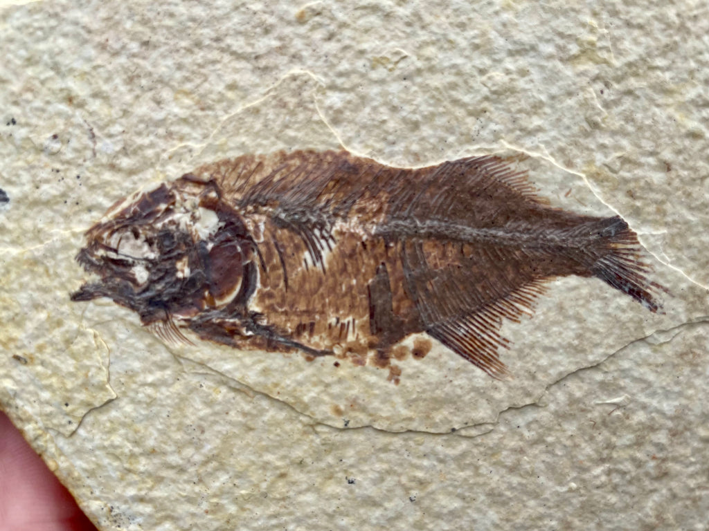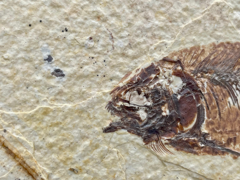 This is a small sized Phareodus Encaustus from the Green River formation in Wyoming showing good soft tissue preservation of skin and scales. This fish species is distinguished by its long pectoral fin and long sharp teeth indicating its carnivorous diet. This area was part of the now famous Fossil Lake during the Eocene period and is from the split fish layers located in the mid depth part of the lake that have more of a very dark brown/red color and pronounced definition including the well preserved teeth this species is known for as an apex predator of its time. This specimen is slightly incomplete with part of the tail and top missing and measures 3” long. It is on approximately 11”x7” non trimmed piece of lake bottom silt stone matrix making it very appealing when displayed. This fish has relatives in present day Central-South America and Southeast Asia.