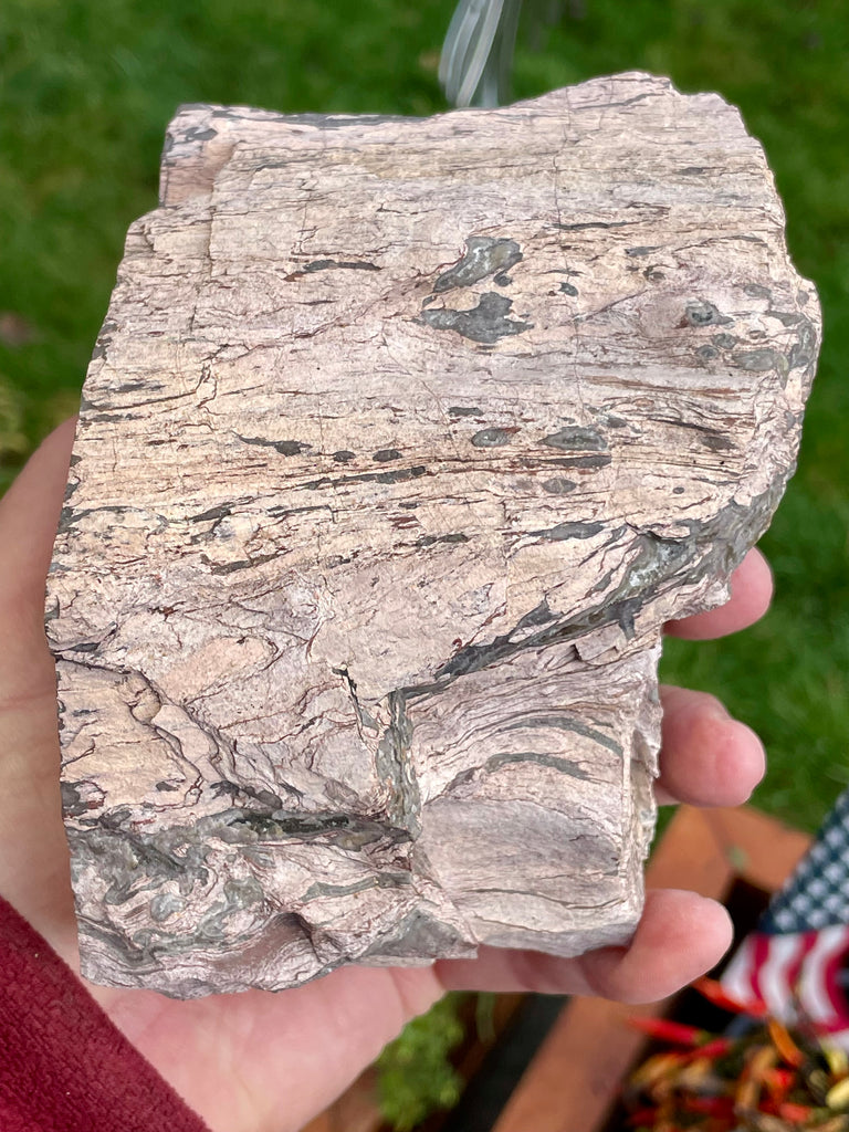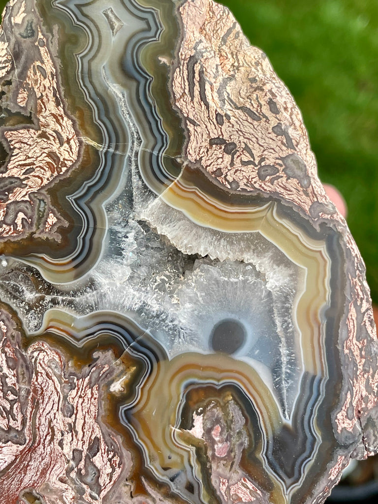 This is a beautiful banded rhyolite agate from North Ankara, Turkey. This has a swirling core of multicolored blue and tan banded agate around a small crystal core. The shell is rhyolite and this type is often mistaken for petrified wood. It is fully polished on the face and is approximately 5” x 3-1/4” and 4” deep