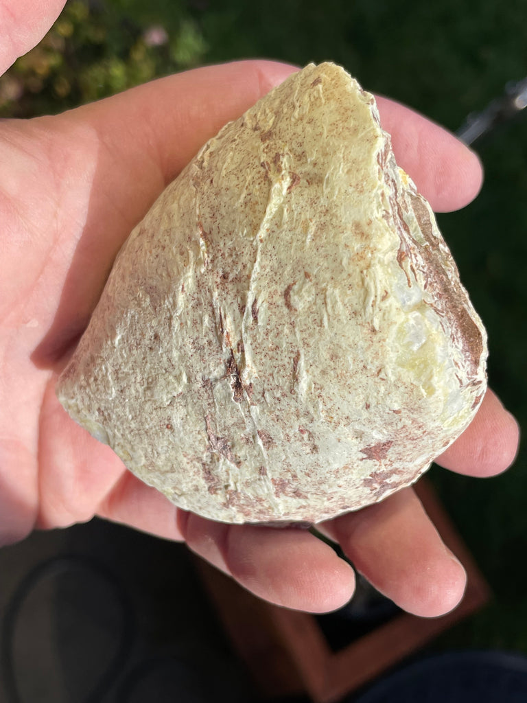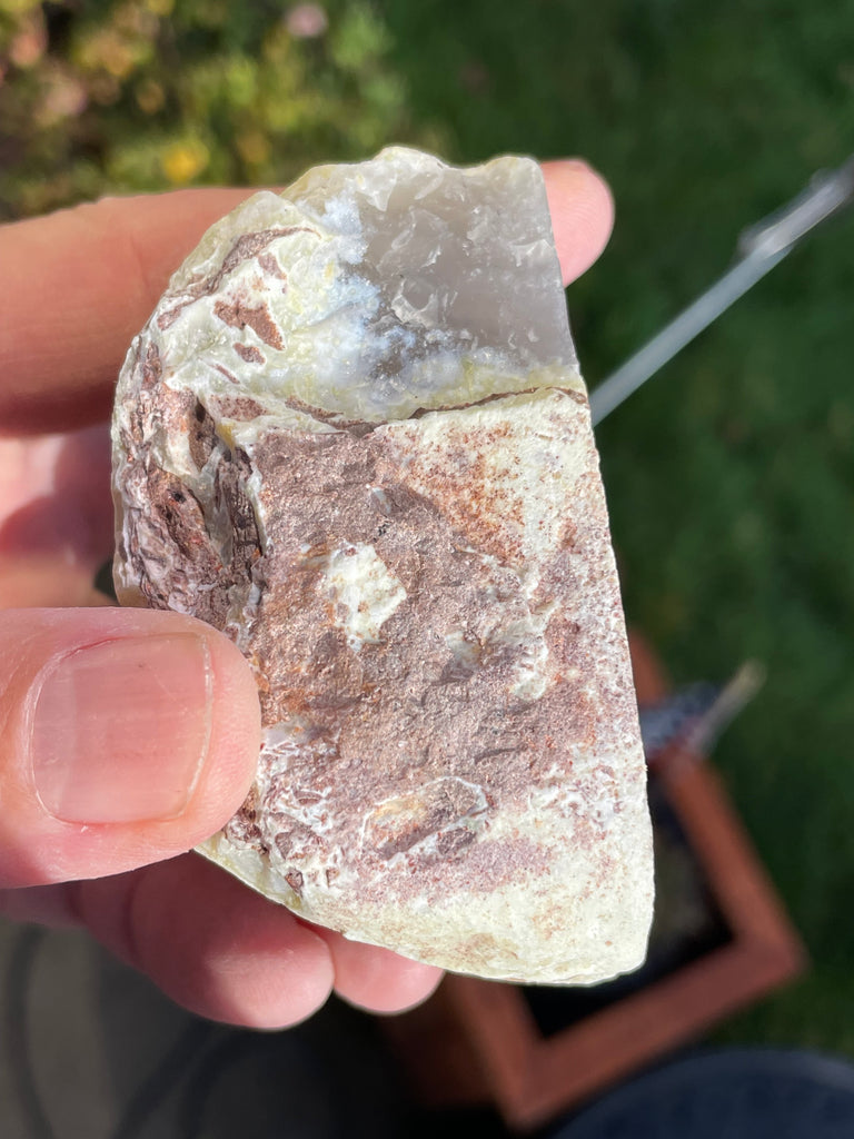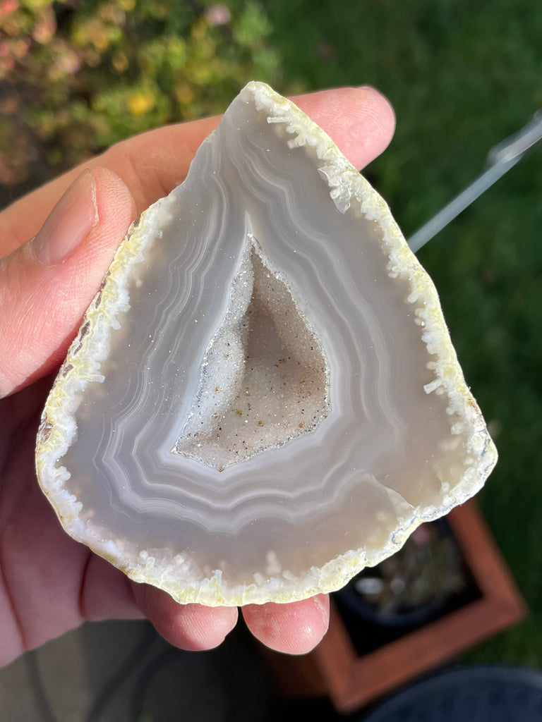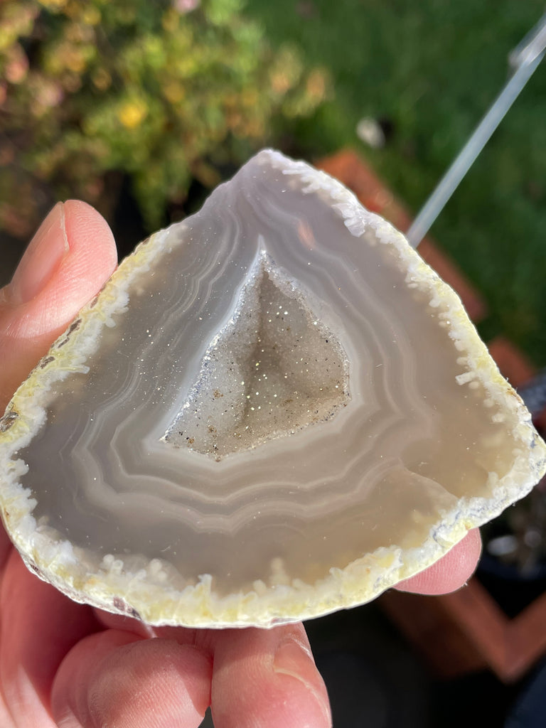 This is an agate from Brazil that when cut still had the water that formed it inside allowing the beautiful spotted druzy crystals to line the hollow chamber. The agate has light colored banding and it sits on its own so a stand is not required. It is polished and is 3” x 2-3/4” and 1-3/4” deep