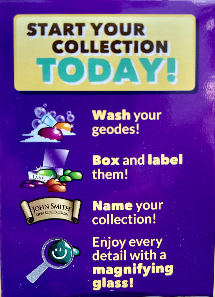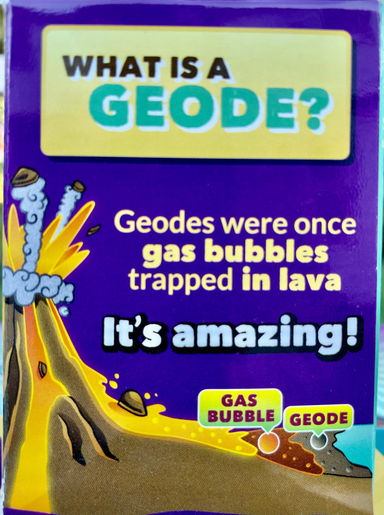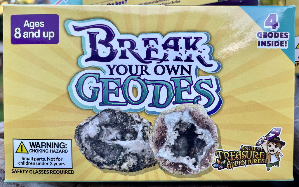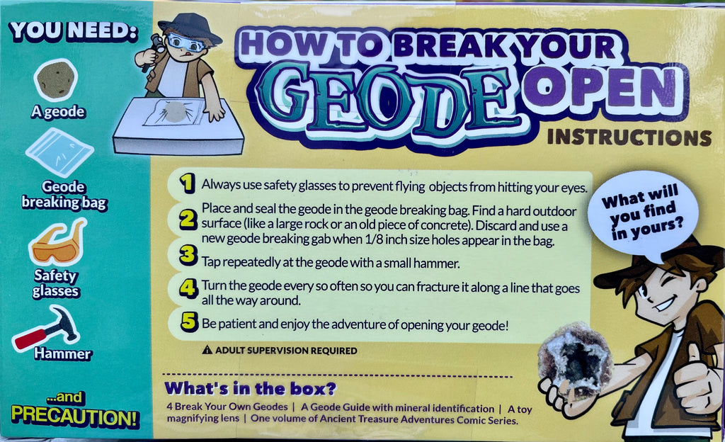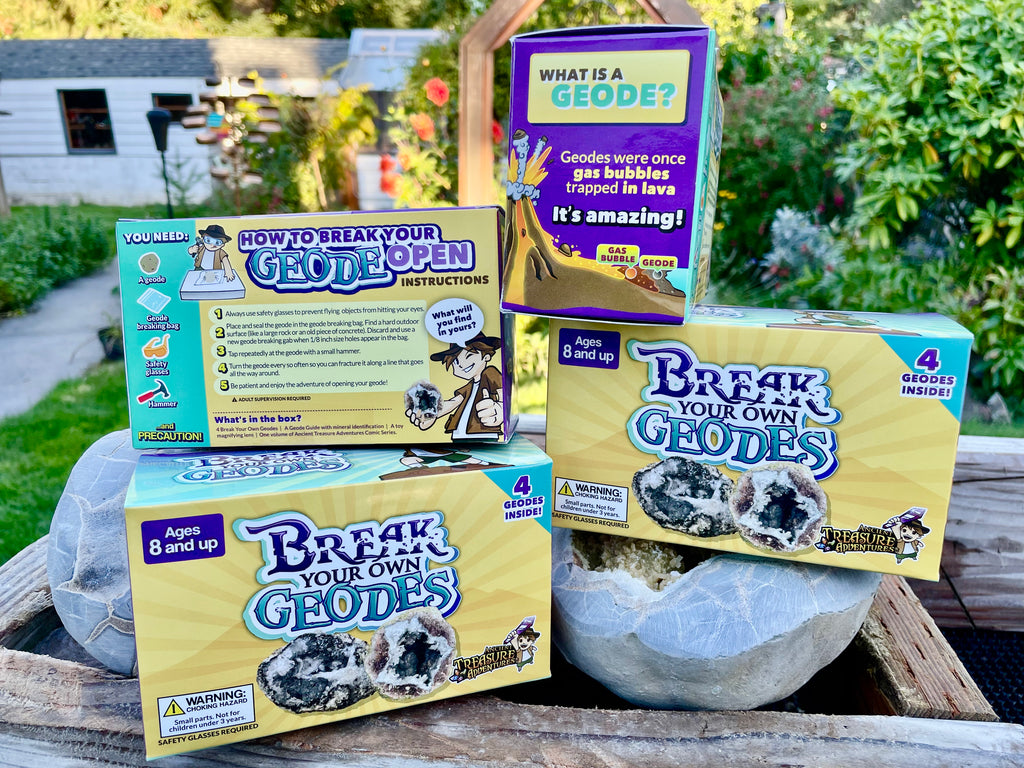 This is a great gift for anyone wanting to learn about the wonderful world of geodes. Each kit includes 4 geodes, a geode guide with mineral identification, a small magnifying lens to view the crystal structure and a Ancient Treasure Adventures comic book.