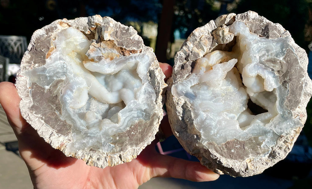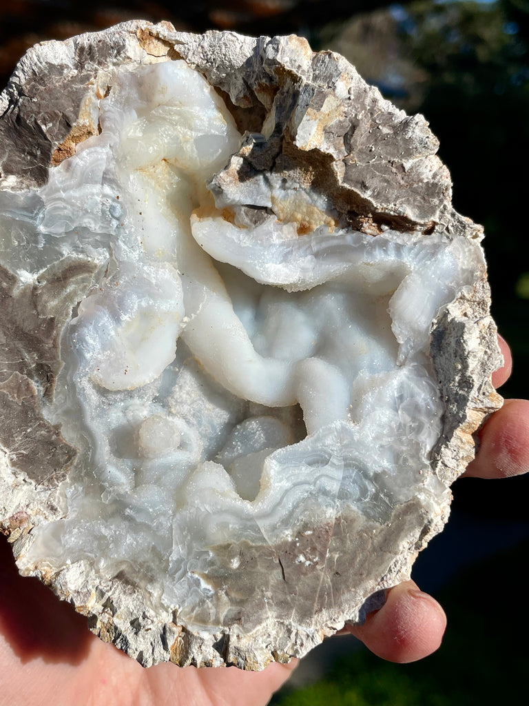This is an outstanding Druzy Mist geode from Mexico that I have cracked open. It is unique having a core full of chalcedony tubes and stalactites along with their signature fine druzy crystals. These are large geodes at 5” x 4” and is UV reactive showing green for trace amounts of uranium in parts of the core.