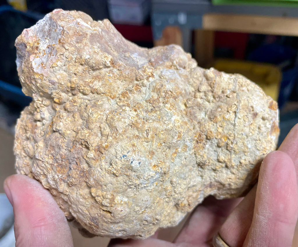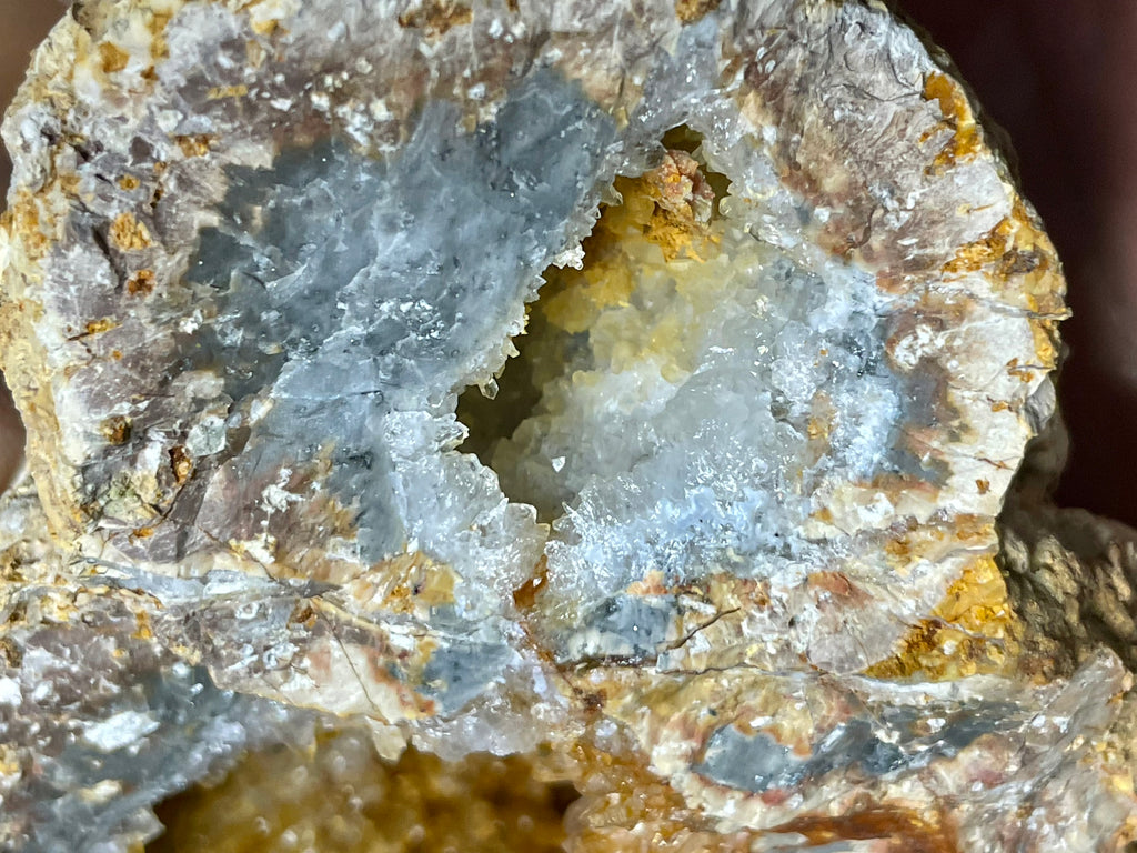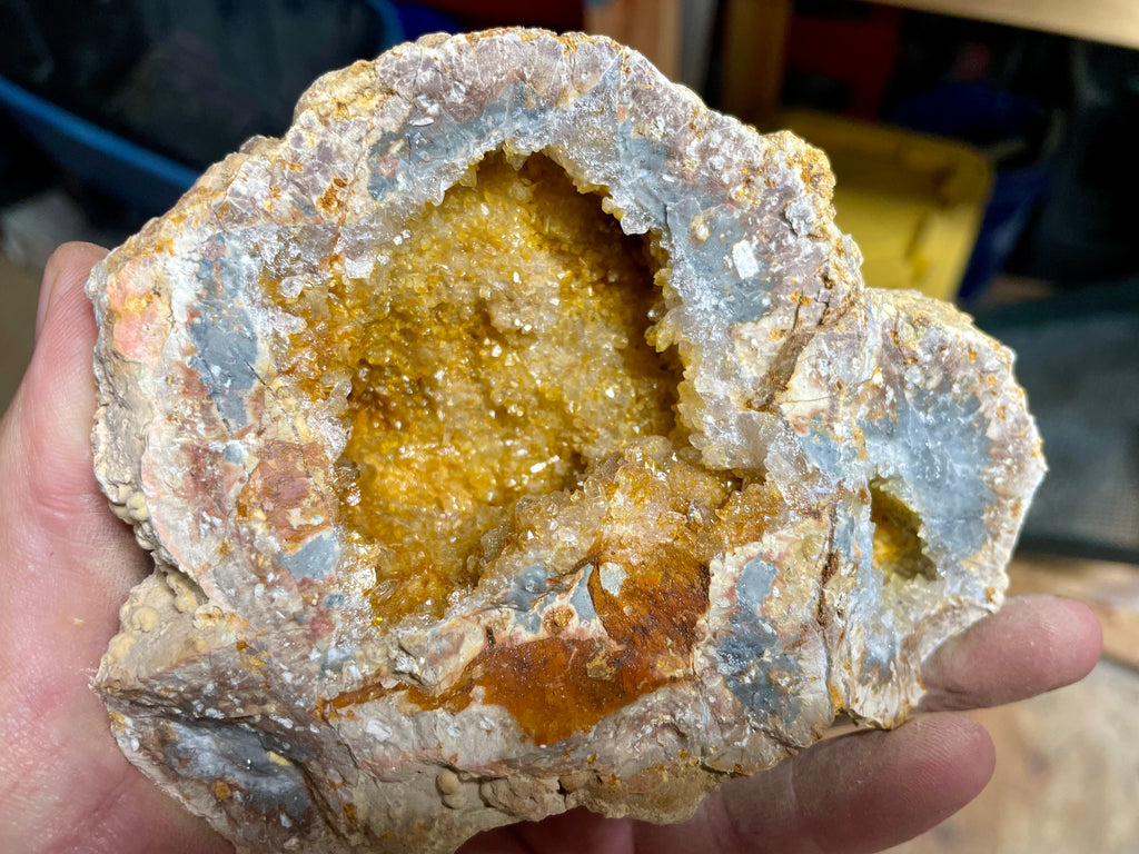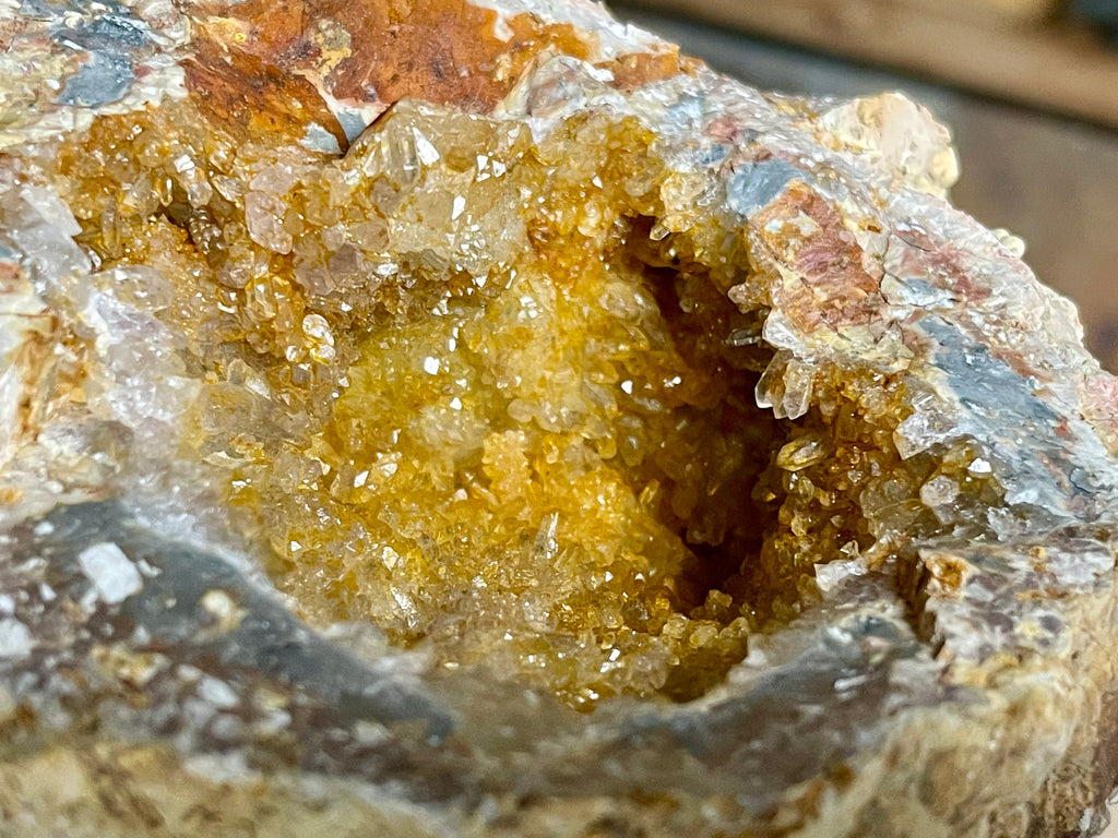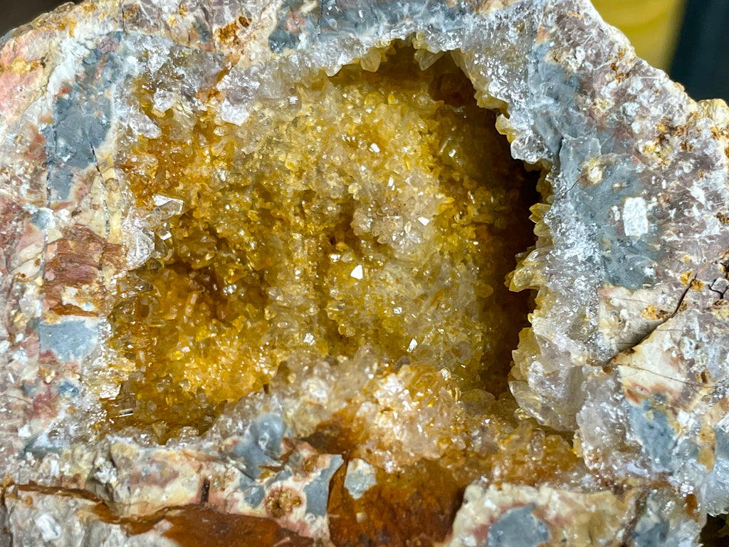 This is a half of a crystal geode that I cracked open to reveal the beautifully rich citrine colored natural crystals lining the interior of two of the three chambers. It is common when the multiple chamber geodes are cracked open that only one half survives intact. This geode is from the Crystal Canyon mine in Mexico. It measures 5-1/2” long and the large chamber is 4” tall.