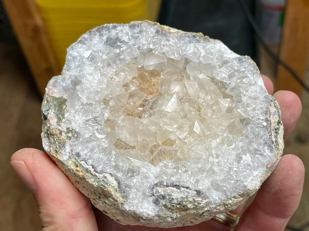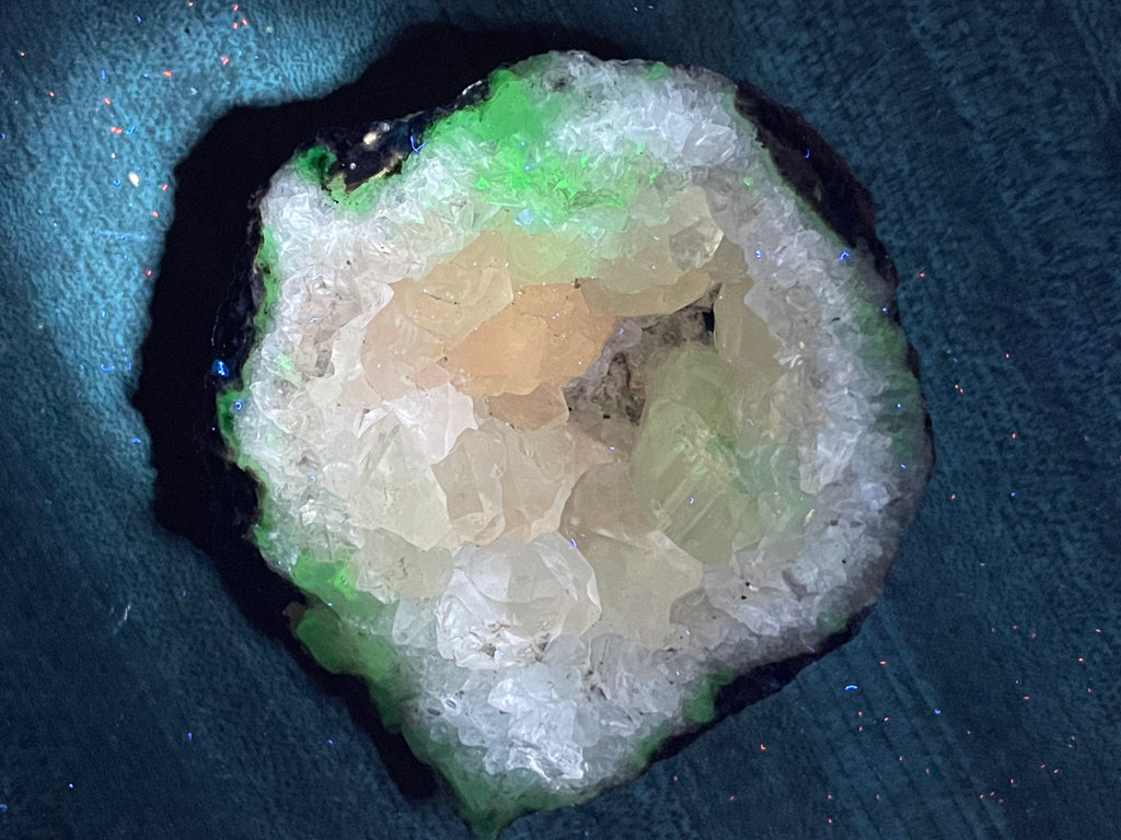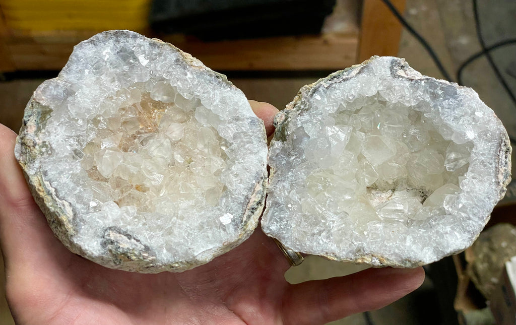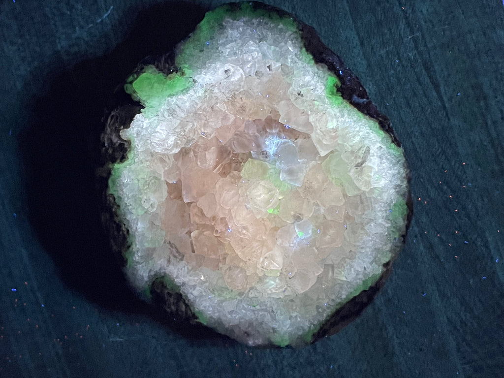 This is a trancas geode from Mexico that I cracked open to reveal the large quartz crystal formations inside each half. Under long wave UV light it also has some green reactivity showing trace amounts of uranium from when it was formed making this one for the UV collection, each half is 3-1/2” across.