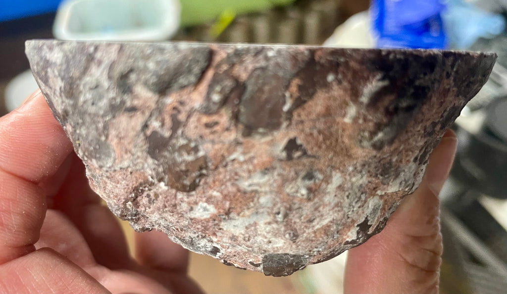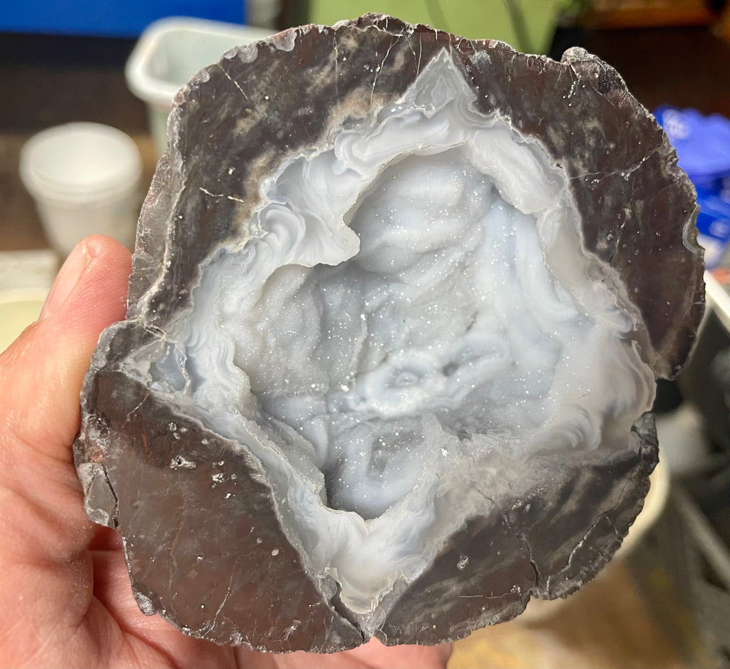 This beautiful half of a geode has the inside of the agate chamber lined with fine druzy crystals showing the flow patterns they are known for. This is a Druzy Mist geode from Mexico. It measures approximately 4” x 4” and is fully polished.