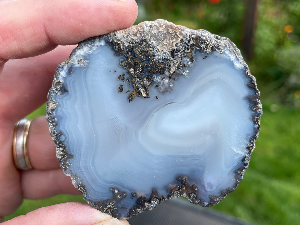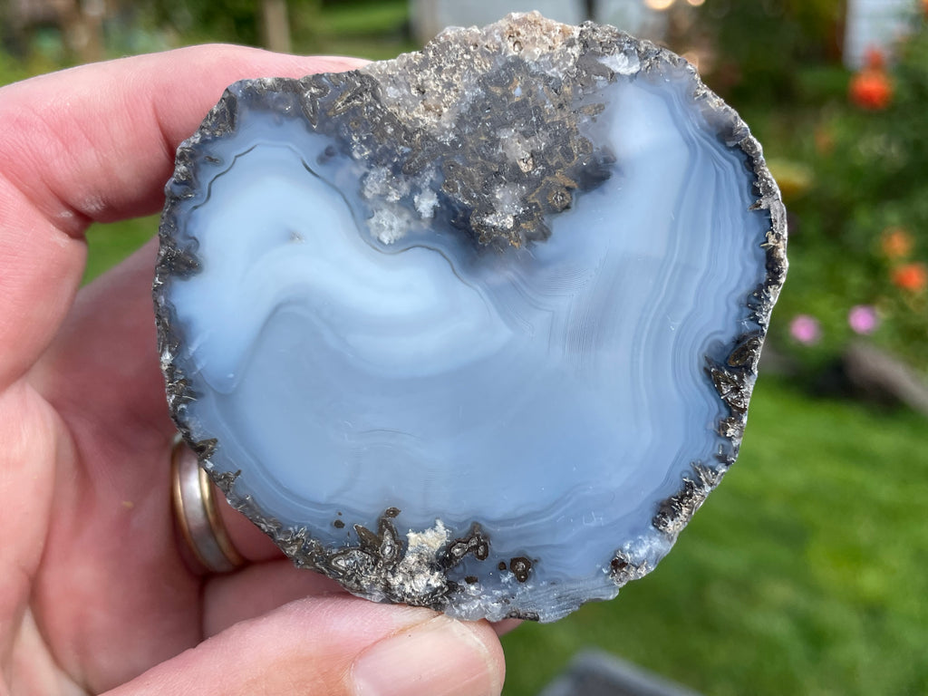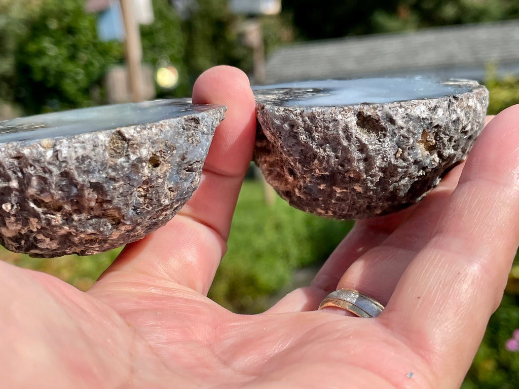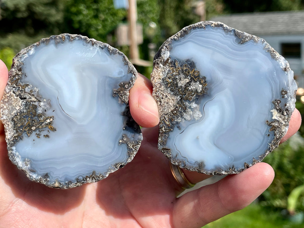 This is a beautiful pair of a polished Los Choyas solid agate from Mexico with swirling bi- color blue agate fortification bands that have some parallax lines. A parallax is created when the agate is translucent enough and the fortification lines are finely spaces and cast a shadow on each other when you move the agate in the light creating an optical illusion.