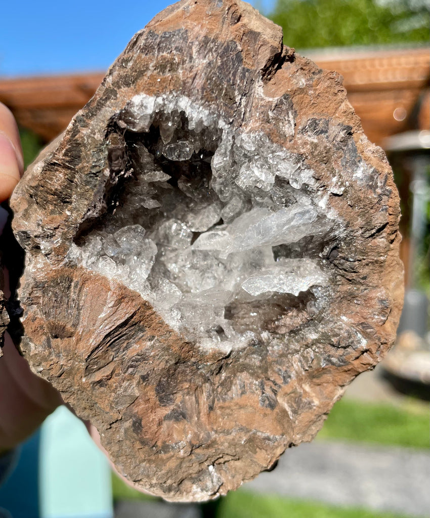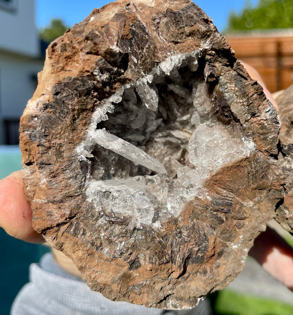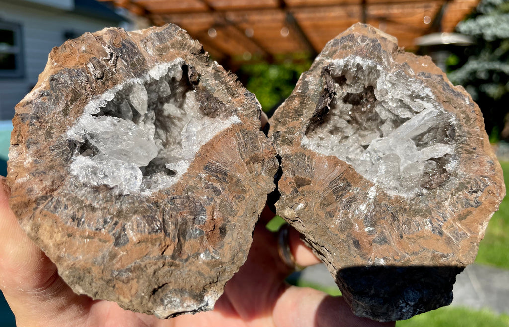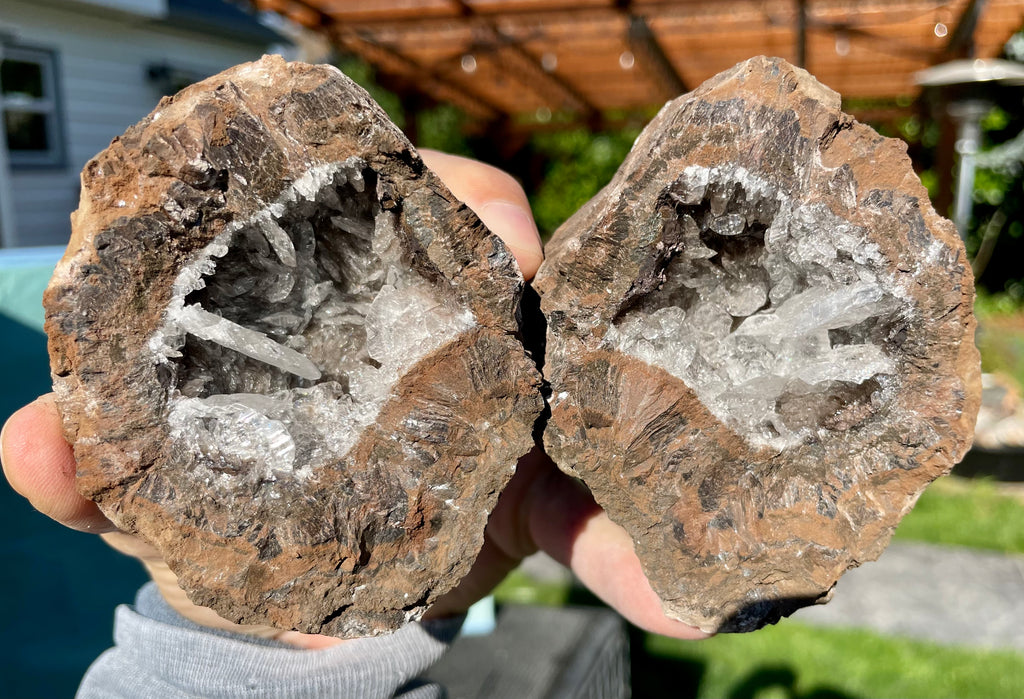 This a geode pair of a highly prized Las Choyas geode or “coconut”. This one has a siderite shell made up of iron carbonate also known as “brown rimmed”. The interior of this geode is has unique and unusual formations of white calcite arranged into plates covering the interior in all directions. I cracked this geode rather then cutting it to preserve the crystal structure in its entirety instead of cutting through some of them. These geodes are mined in the Chihuahuan desert of Mexico. Each side of this geode is approximately 3” x 3-1/2”