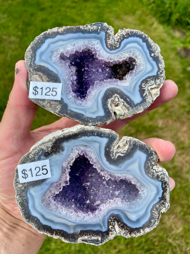 This is a beautiful pair of crystal geodes from Mexico that I have cut and polished to reveal a beautiful blue banded agate shell and a crystal core of very nice dark amethyst crystals in a large hollow pocket.