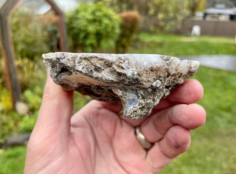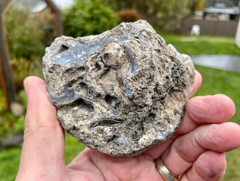 This Las Choyas geode half has beautifully fine light blue agate banding all the way to the center swirling around three darker areas making very interesting patterns. It is fully polished and is approximately 3” x 3-1/2”