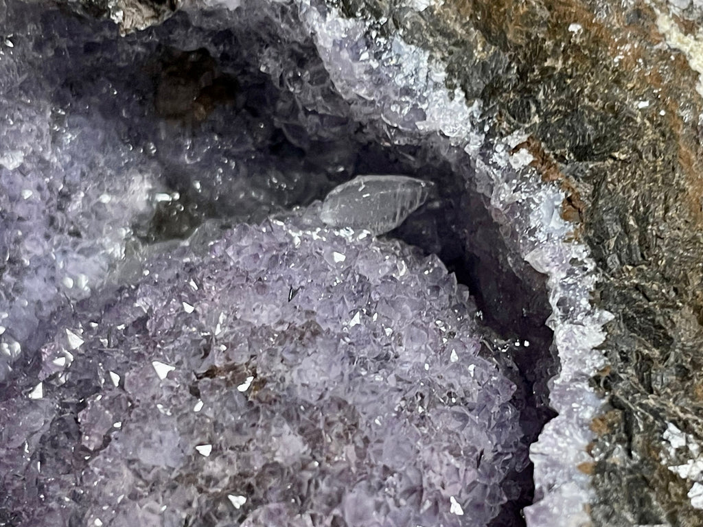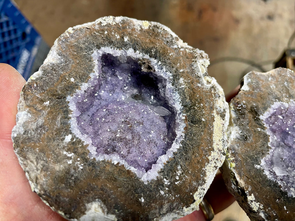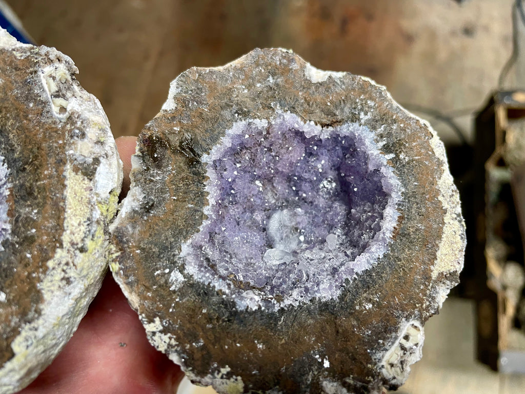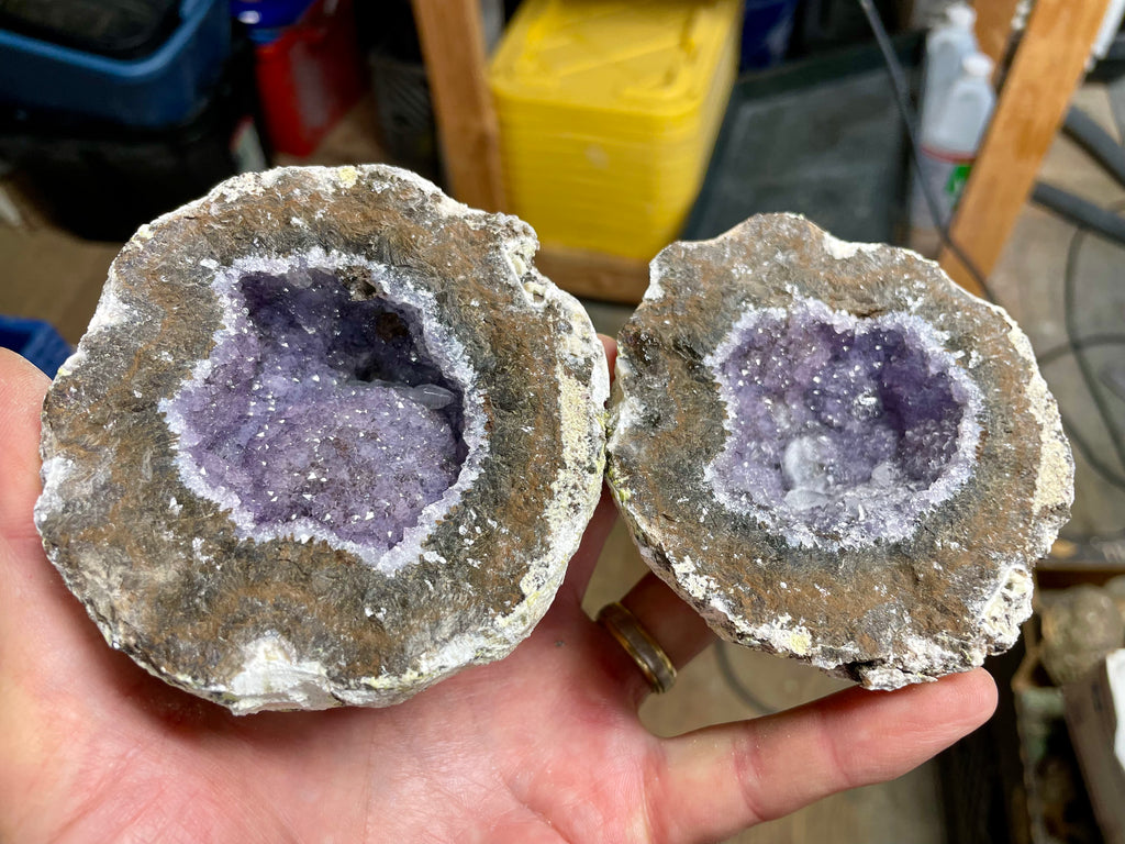 A beautiful Las Choyas geode pair that I have cracked open to reveal the sparkling amethyst crystals lining each half along with a terminated quartz companion crystal in one half. Only 10% of these geodes contain amethyst. This is known as a “brown rimmed” coconut geode with the outer shell made up of a mineral called Siderite made up of a dark brown iron oxide. Each half is 3-1/2” across and the backs are intact.