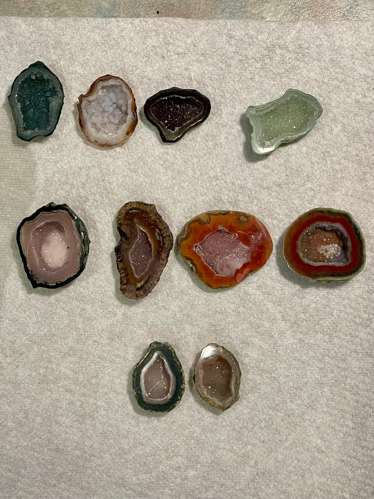 These tiny geodes are formed in a basalt layer and removed with hand tools and then cut and polished to reveal the beautiful and varied colors of the shell and fine crystals inside.