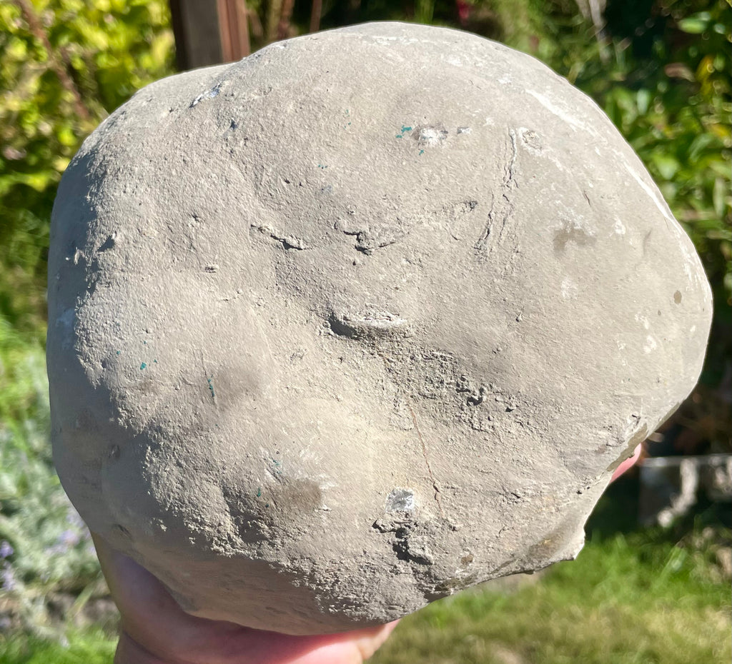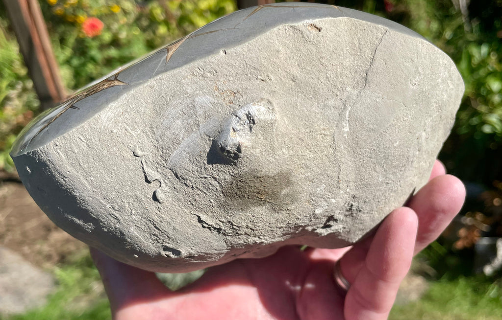 This is an Utah Septarian nodule that I free-form polished. This is a large septarian nodule and it has a large solid core. This one also fossils that are still covered just under the surface around the outside of the nodule, Septarian also is UV reactive.