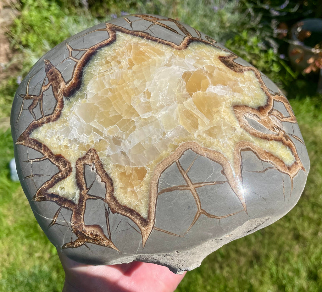 Septarian was formed in the ancient sea bottom during the Cretaceous period. They evolved from sea life from the time being encased in a nodule and this initiated the formation of a septarian nodule. In most of them the snail, clam or other critter is gone but the cavity remains and is filled with Aragonite (dark brown) and calcite that at times formed beautifully arranged yellow crystals on the inside of a hollow chamber.