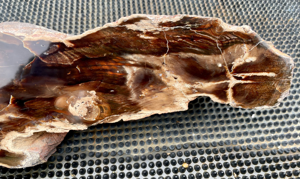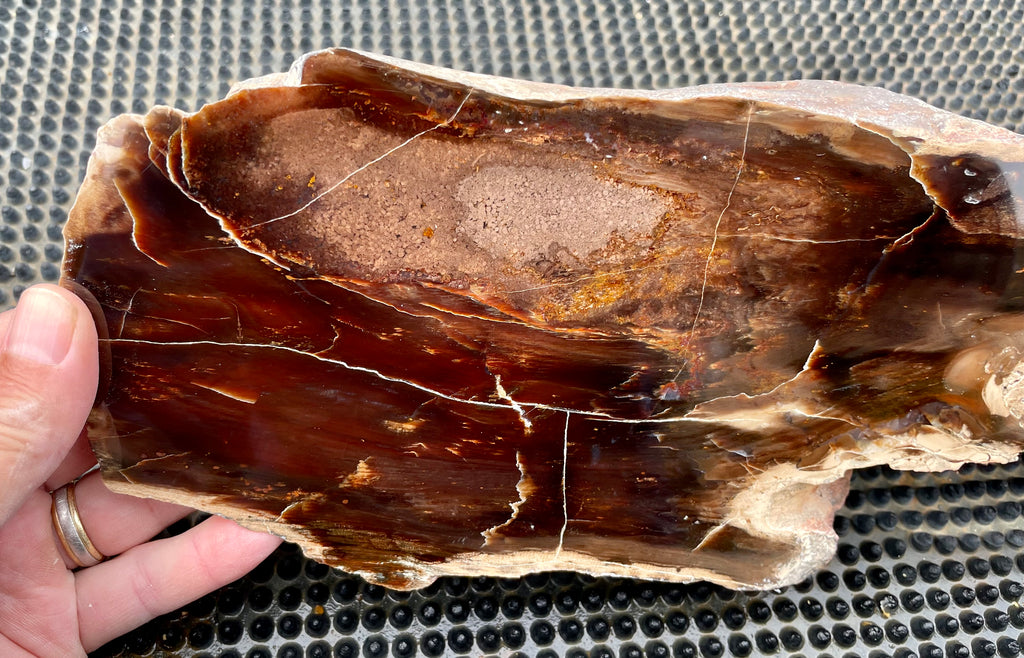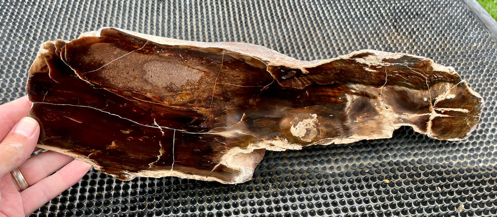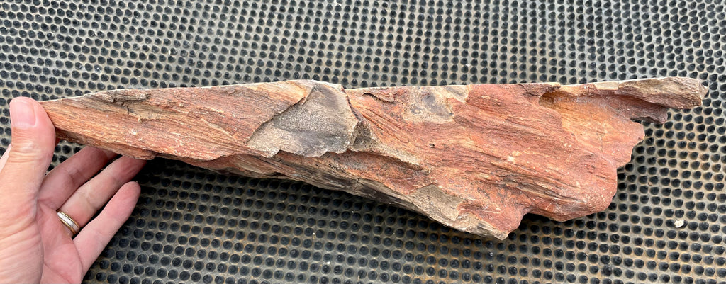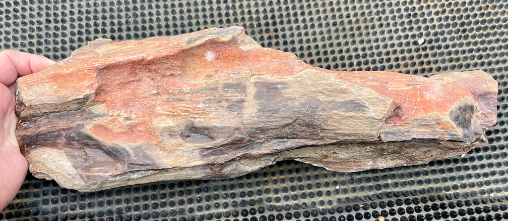 This is a very large specimen of Oregon Petrified Wood with rich browns and reds showing the grain of this beautiful fossil piece. It is cut and polished on the top and natural on the sides and bottom. This piece weights nearly 7-1/2 lbs and is approximately 17” long, 5” wide and 4” deep at its thickest point it has a nice shape that tapers toward one end.