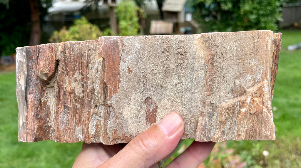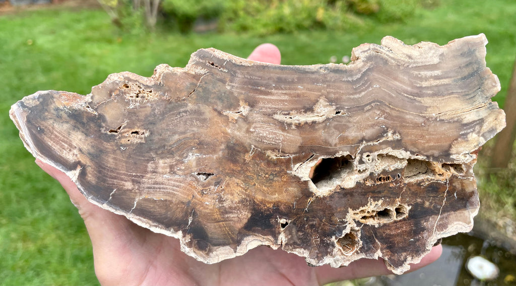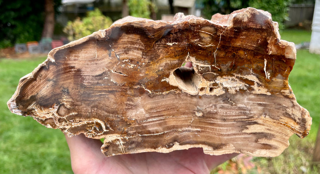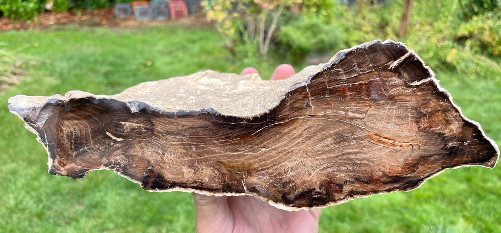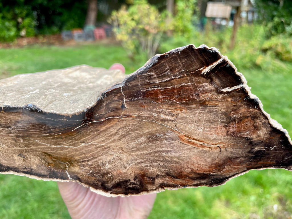 This very thick slab of beautiful petrified wood show’s beautiful dark grain on the polished side and on the edges. It has a small void in the center that goes all the way through where it rotted away prior to mineralization. This piece is 4.65 lbs and is approximately 7-1/2” long, 3-1/2” at its widest point and nearly 3” deep with a flat bottom it sits on.
