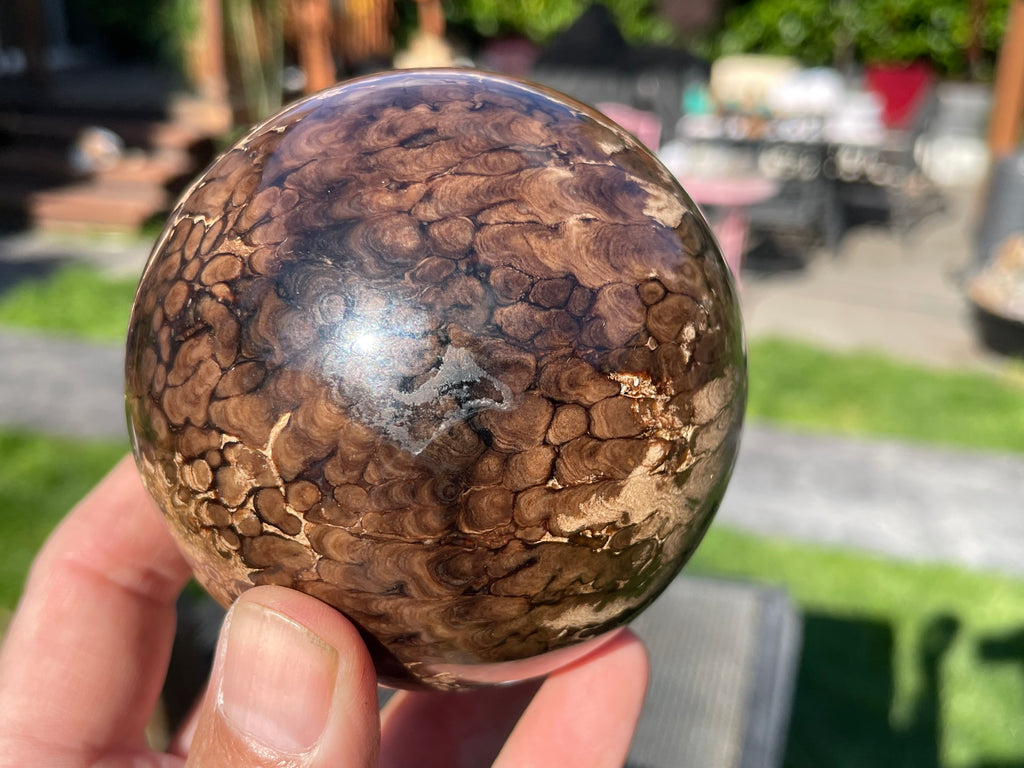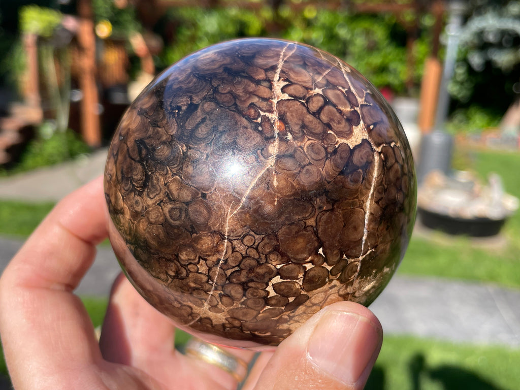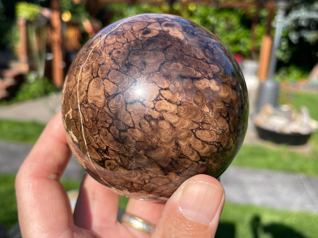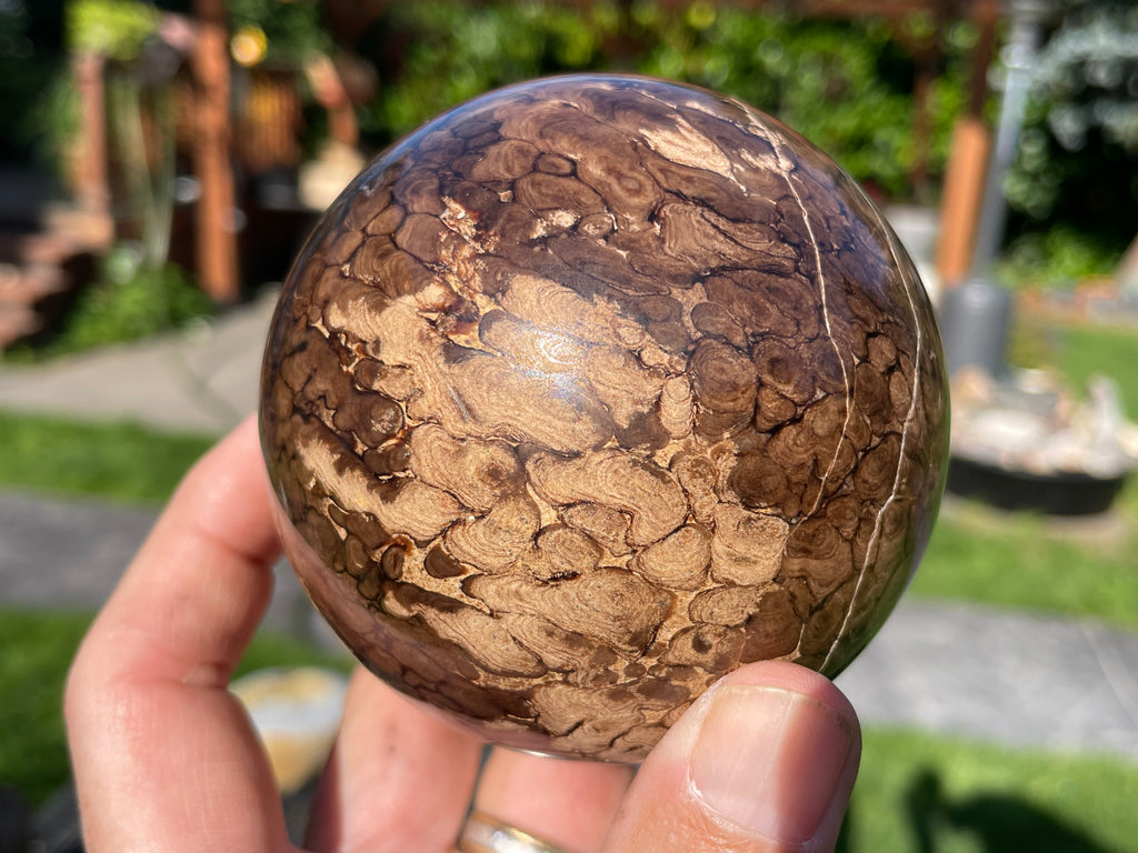 This is a stone sphere made in Oregon from material found in Wyoming. This is a fossilized material called brain algae and is over a billion years old. There wa not much of this material found so it is a very unique sphere.