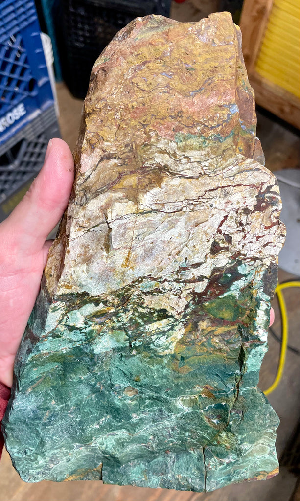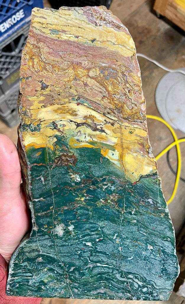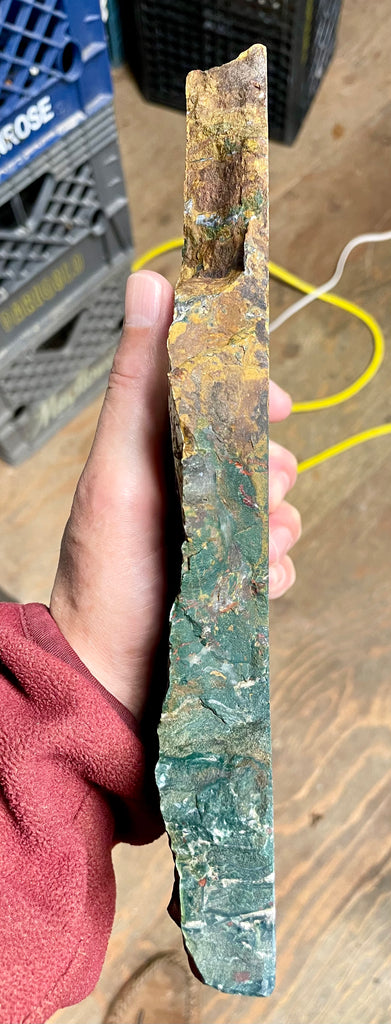 This is a large “heel cut” slab with one side fully polished and the other side natural from Oregon. This piece has a. Beautiful green layer with swirls of color that changes to yellows and browns. It is 9-1/2” tall, 6” wide at the base and 1” thick. It can be displayed laying flat or in a stand.