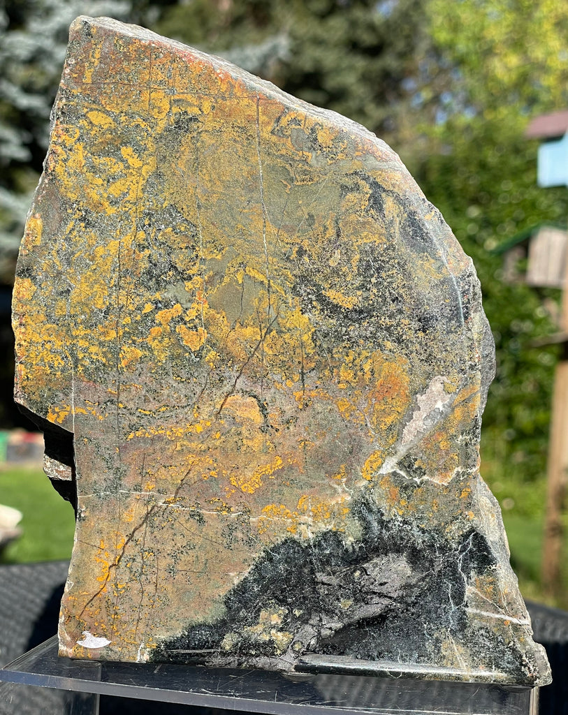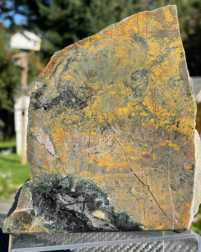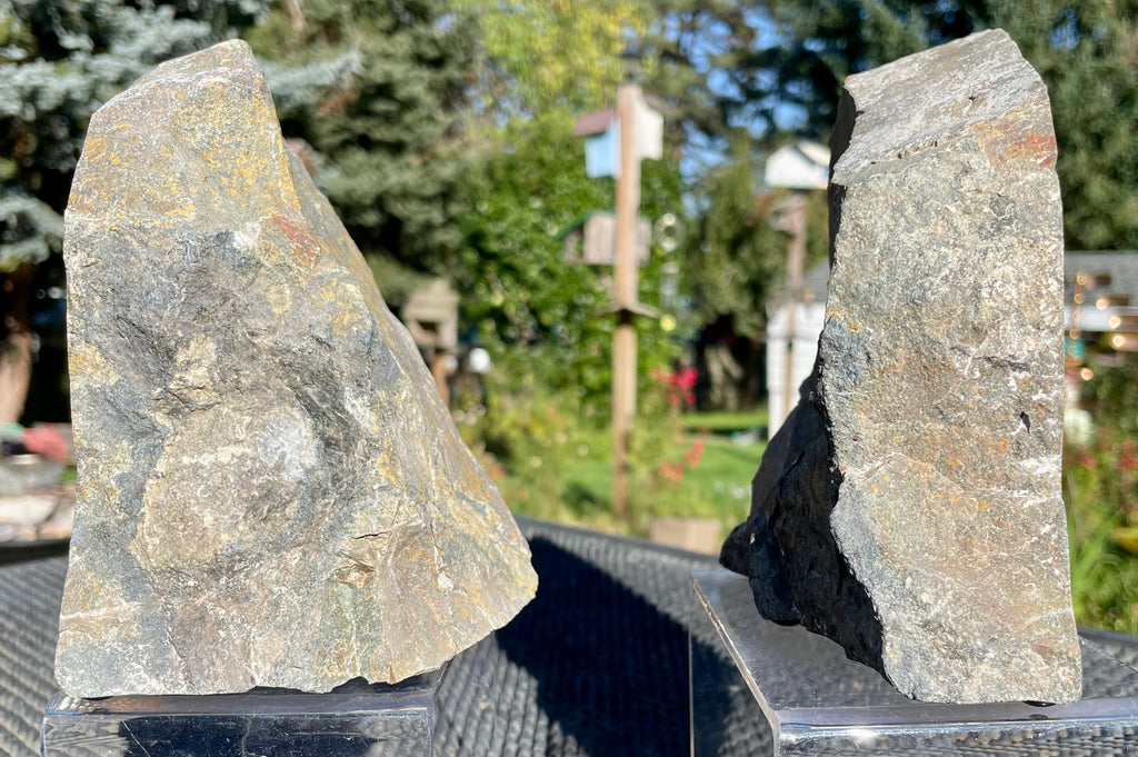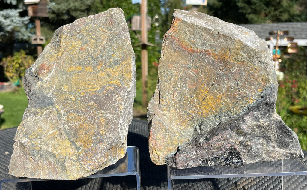 This pair of bookends I cut from Ocean Breeze Jasper found near Coos Bay, Oregon in a rock quarry. The material was too hard to run through their rock crushers so it was considered waste and Ocean Breeze Jasper was found! This comes in several colors with this piece being primarily yellow and dark blue.
