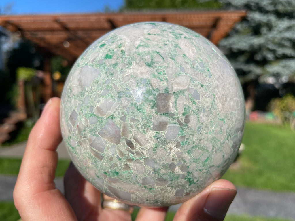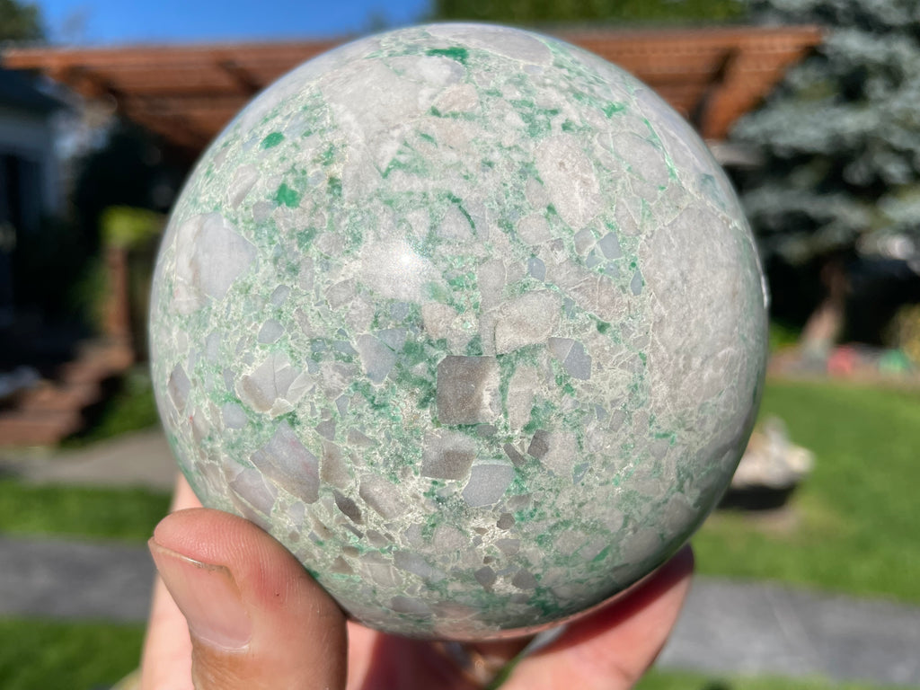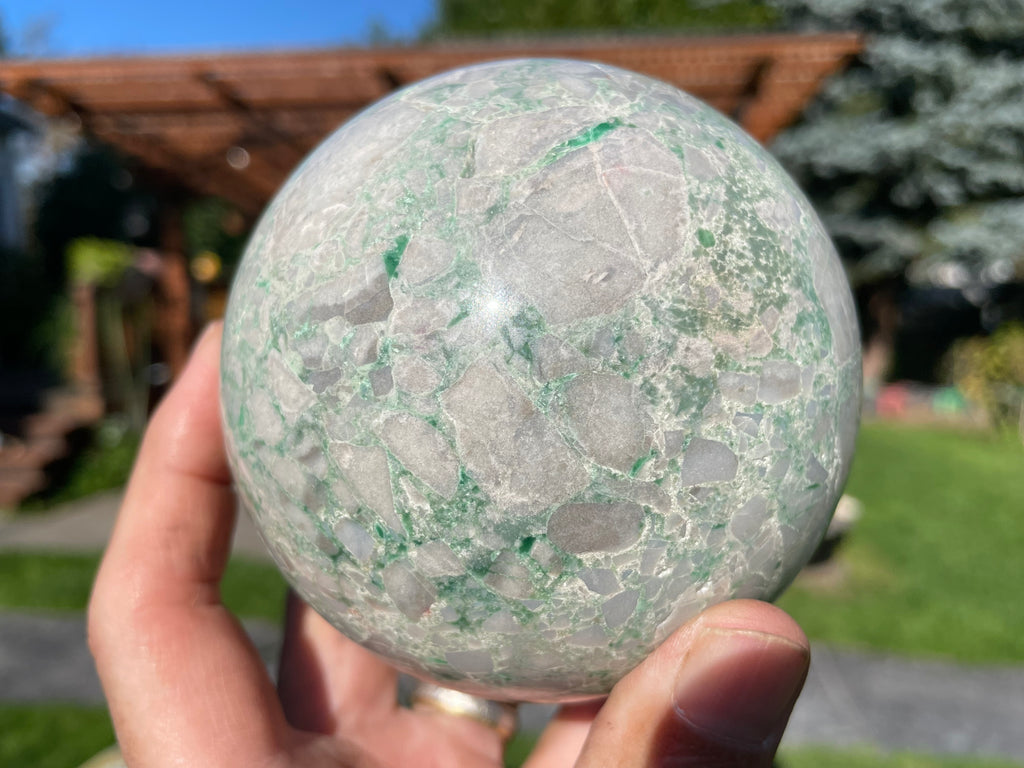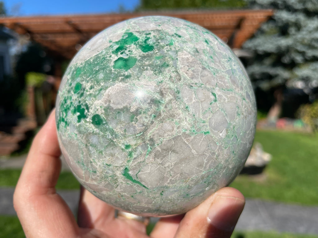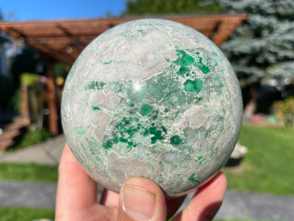 This is a stone sphere made in Oregon from material found in Western Utah. It has the beautiful characteristic darker green with lighter green and grey swirls.  This is a rare gemstone also known as Utahlite and is sometimes mistaken for turquoise.