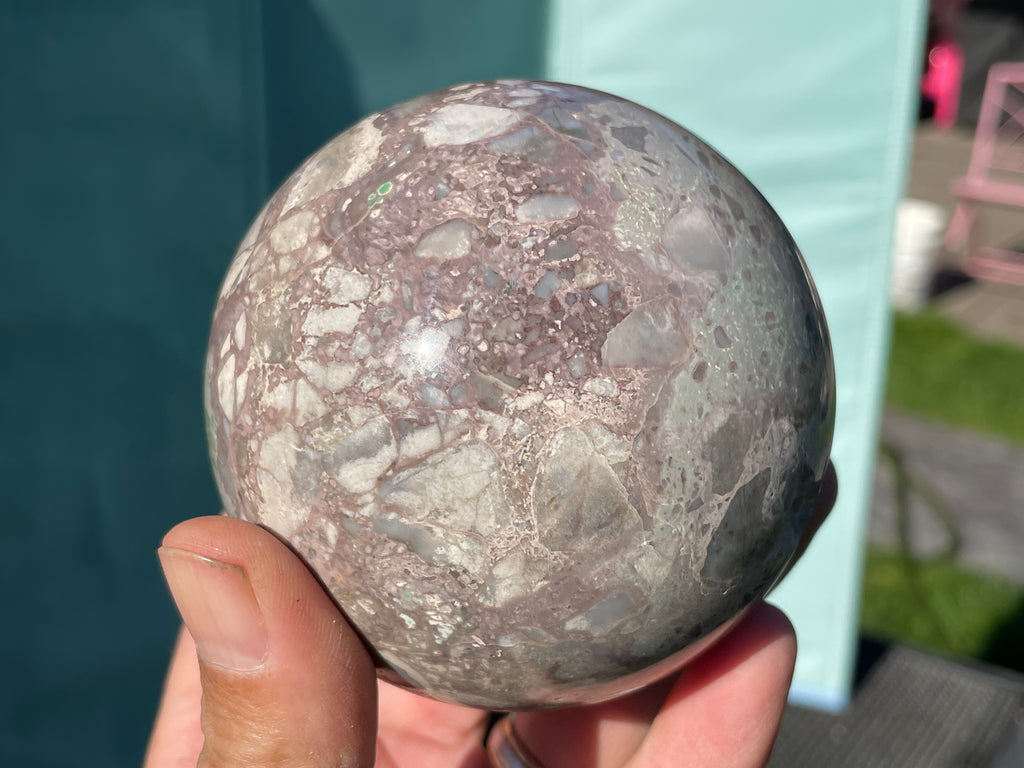This is a stone sphere made in Oregon from material found in Western Utah. It has the beautiful characteristic darker green with lighter green and grey swirls. This is a rare gemstone also known as Utahlite and is sometimes mistaken for turquoise.