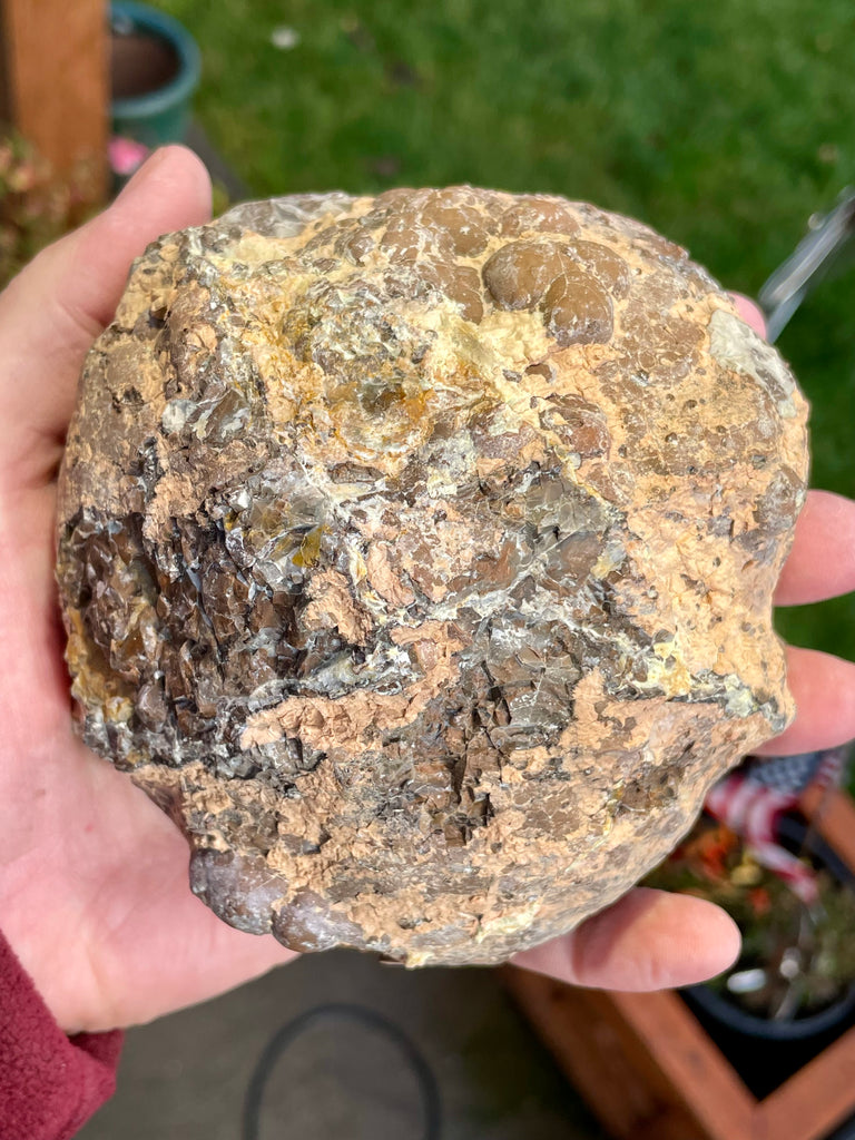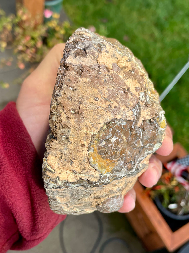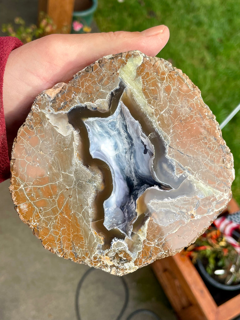 This is a half of a thunder egg I dug at the Polka Dot mine in Central Oregon. It is fully polished with a core of translucent coffee colored agate with light colored common opal and a hollow center. The shell is rhyolite and the back the thunder egg is complete and is approximately 4-1/2” long and 4-1/4” wide.