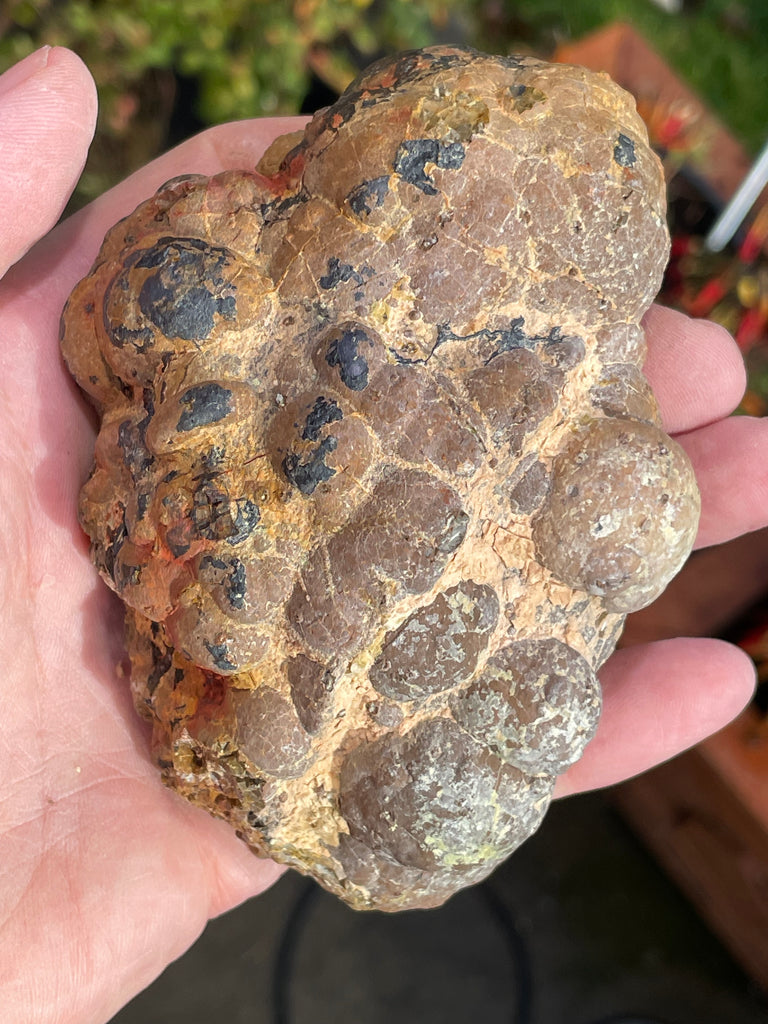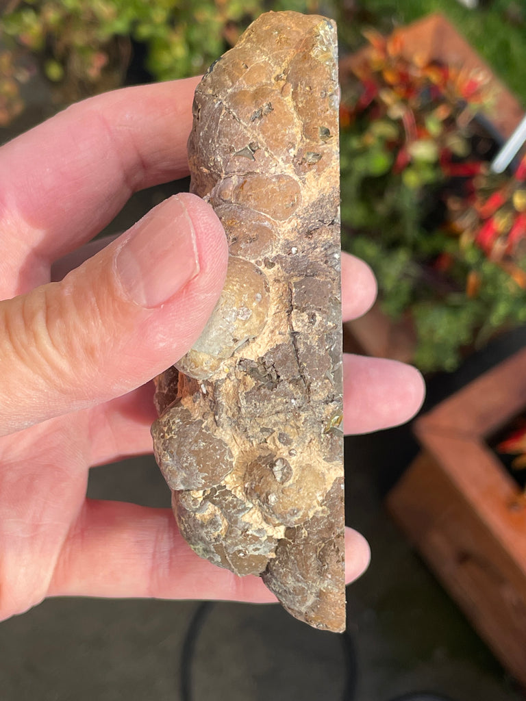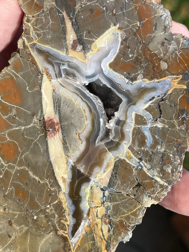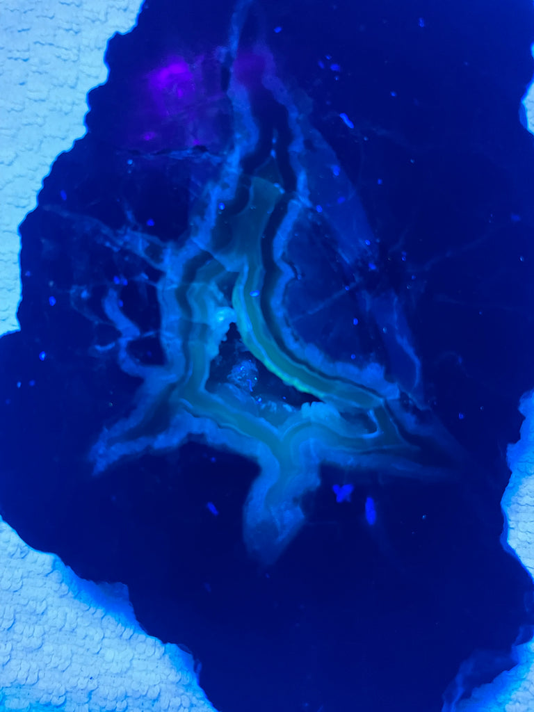 This is a small egg shaped half of a thunder egg I dug at the Polka Dot mine in Central Oregon. The small ones here used to not have much of a core in them and were avoided but in the current diggings I have cut quite a few of them and they are quite nice. It is fully polished with a core of translucent agate, common opal, small jasper spears (tan with small spots). It is also slightly UV reactive and I have included the UV photo and is 4-1/4” long and 3” wide.
