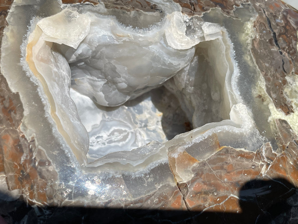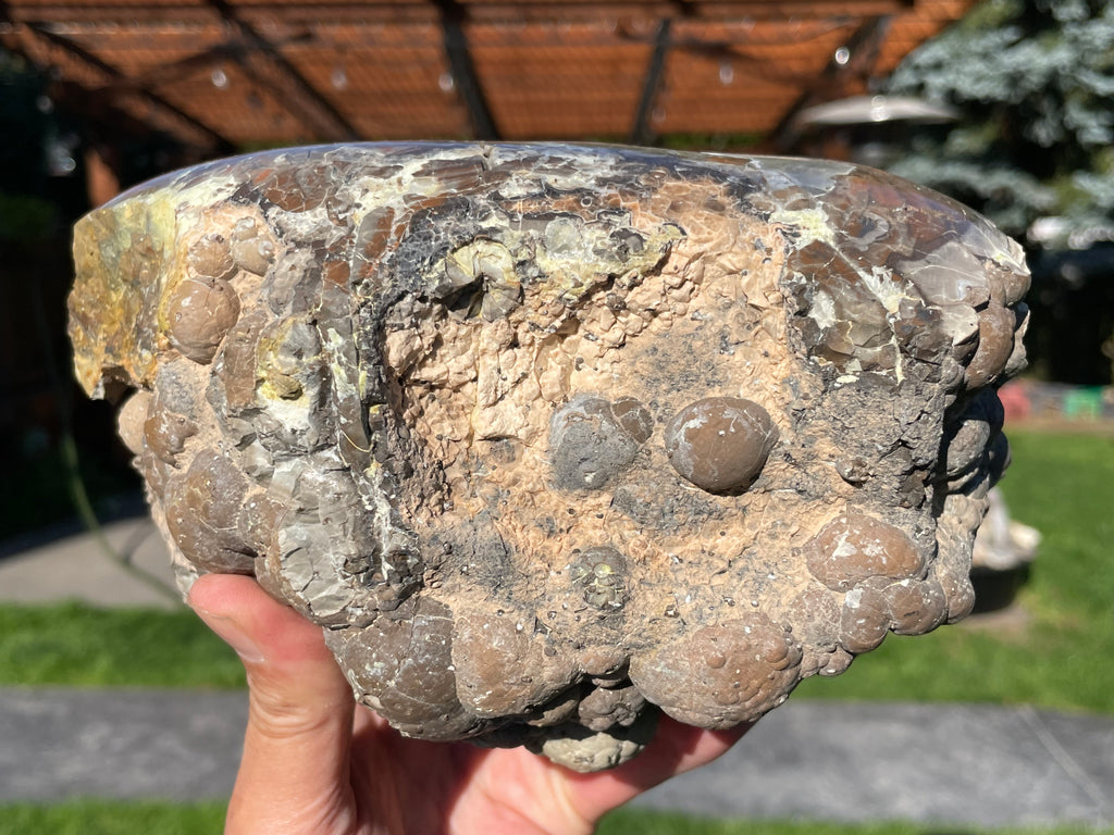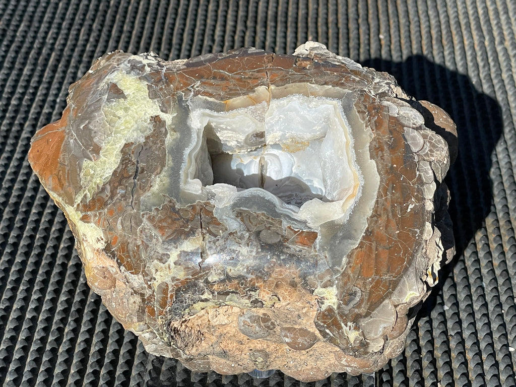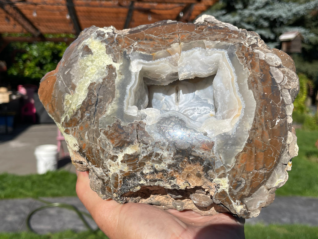 This is a large thunder egg I dug from the Polka Dot Mine north of Madras, Oregon in the canyons near the community of Ashwood. I have shaped this piece into a polished freeform art piece suitable for display or it can be core drilled to the appropriate size for your tubing to make a small to medium fountain and a flat bottom can be cut to sit on. It has a band of translucent agate along with an area of common opal and has the characteristic picture rhyolite the “canyon rim” thunder eggs are known for.