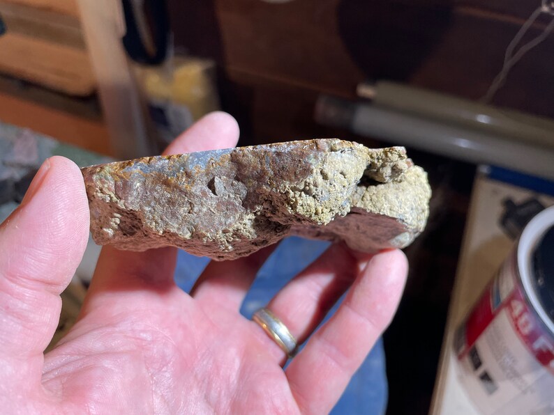 This half of a cluster of thunder eggs is from the McDermitt area on the Oregon/Nevada border. It has beautiful bright yellow plume inside a bi-color blue agate core. It is fully polished and weighs nearly 10oz.
