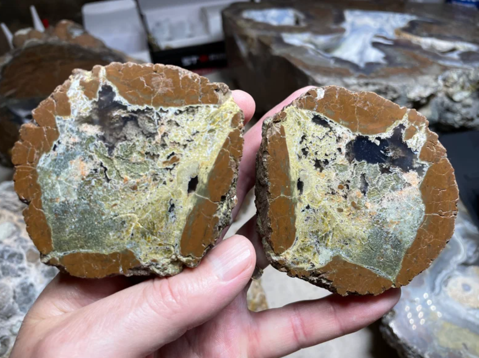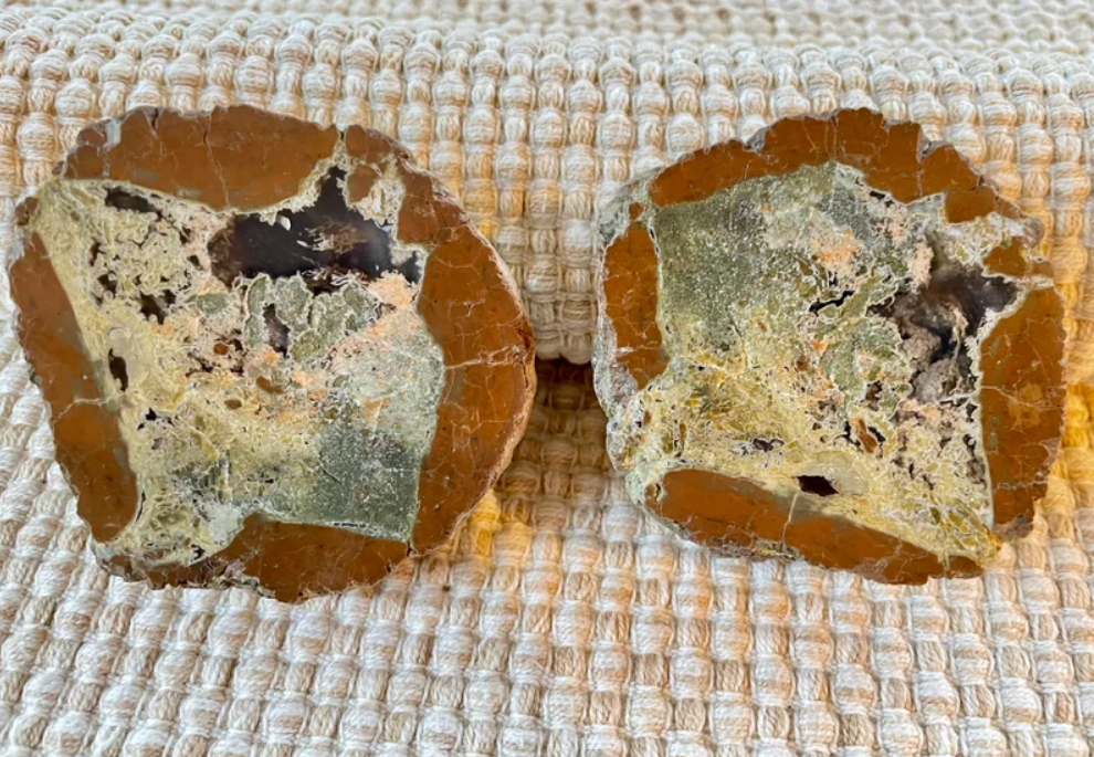 A pair of beautifully detailed fully polished Priday thunder eggs with nice agate and moss inside the fully filled chamber. These are from the Moss Bed that produces these unique and beautiful thunder eggs! They are from the Richardson’s Ranch in Central Oregon.