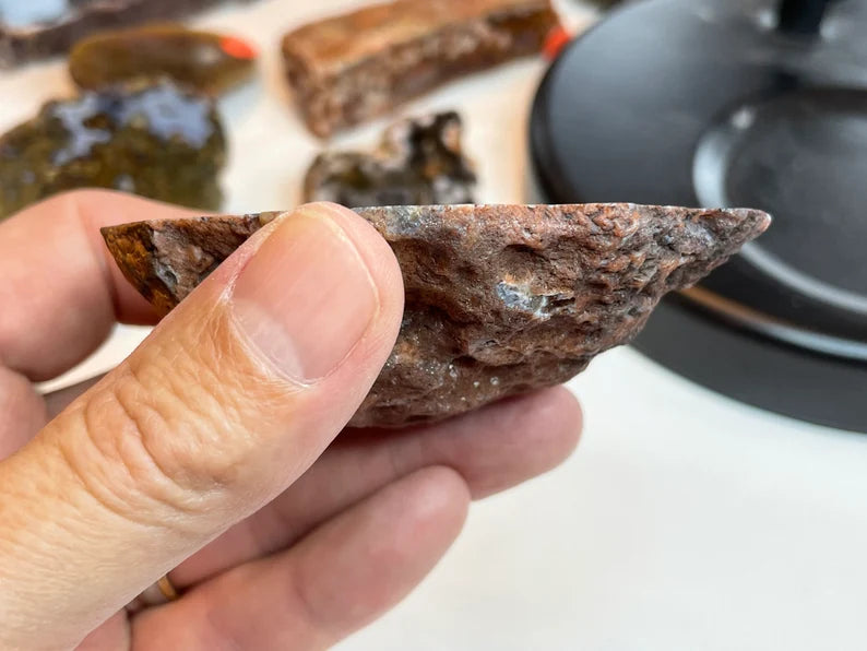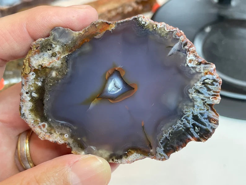 This is agate from North Ankara, Turkey has a deep blue look with nice colors inside and a nice little druzy crystal pocket in the center. This item is fully polished and is approximately 5 oz and 3-1/4” x 2-3/8”
