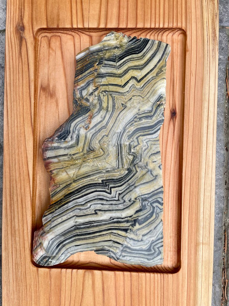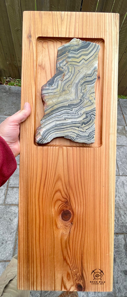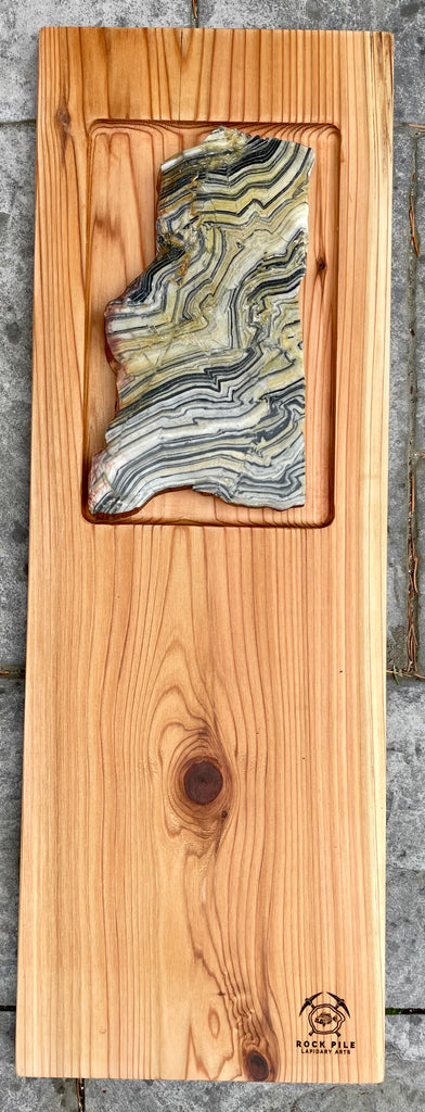 This board is made from cedar milled from storm damaged trees on our property and the stone is a thick polished slab of Zebra Quartz from Australia.