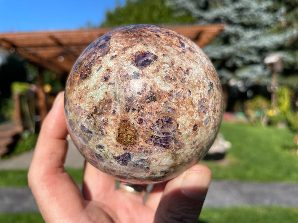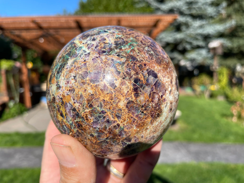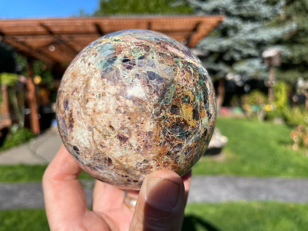 This is a stone sphere made in Oregon from material found in Western Utah. The claim owner named this material Insane Jasper and his claim has been all mined out but similar looking material may be available from other locations. This material contains pieces of amethyst, azurite, chrysocolla, fluorite and malachite in a light colored soft matrix but this stone is just as it is out of the ground and not created. Some of these materials do react to UV light.