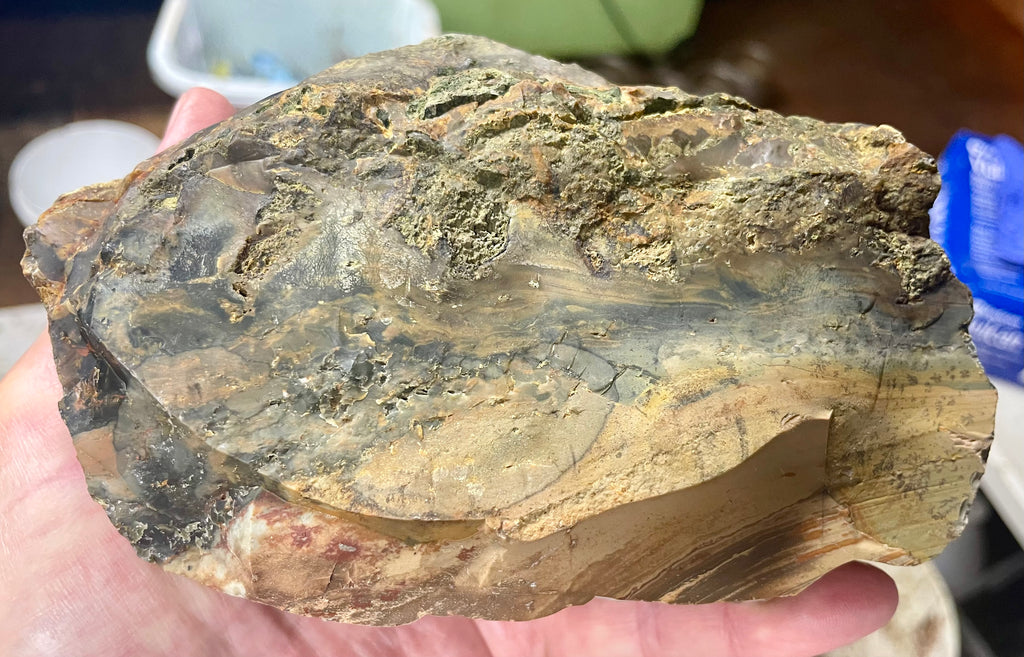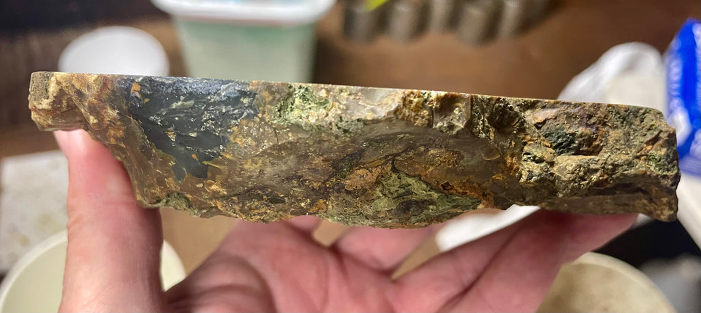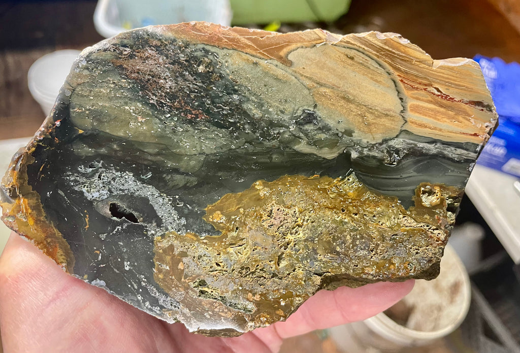 This is an end or heel cut of the famous Blue Mountain Jasper from Oregon. This material is known for its orbs and picture jasper look of blues, green and browns. This piece is thick and fully polished measuring approximately 6” x 3-3/4” and 1” thick. The source for this material is in question and the prices for rough has increased dramatically.