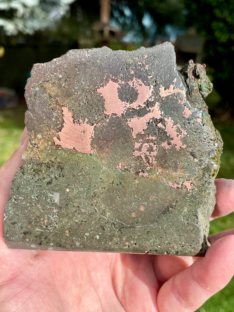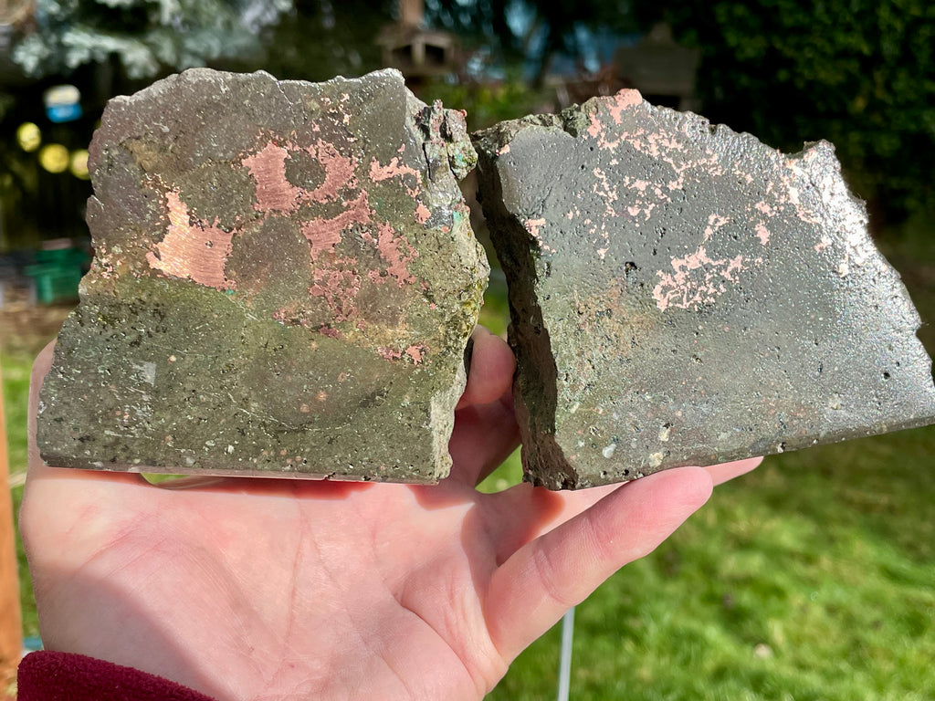 This is a set of matching copper ore bookends or display pieces from the Michigan area. The face of each is polished and clear coated to prevent tarnishing and the rest has been left natural. Together they weigh 4 lbs and are approximately 3-1/2” tall and 3” wide