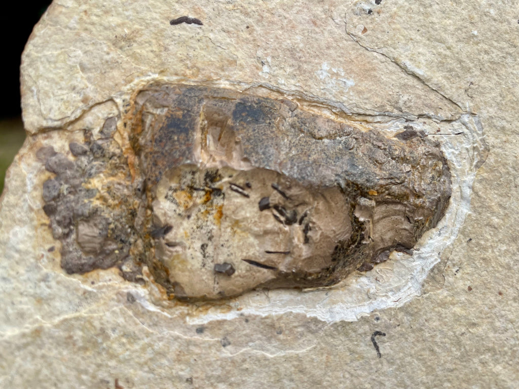 This is a large well preserved piece of Coprolite (fossil poop) that is likely from a crocodile I found in the mid level split fish layer of fossil lake it has detailed bone preservation that is very dark reddish brown. This specimen has part of its side missing allowing us to see the details of the fish bones of a recent meal. It is 3” long with great details shown in the very dark red/brown color and includes a bonus partial fish fossil and some fish Coprolite. It is on a piece of naturally shaped lake bottom silt stone that is approximately 9” x 11”