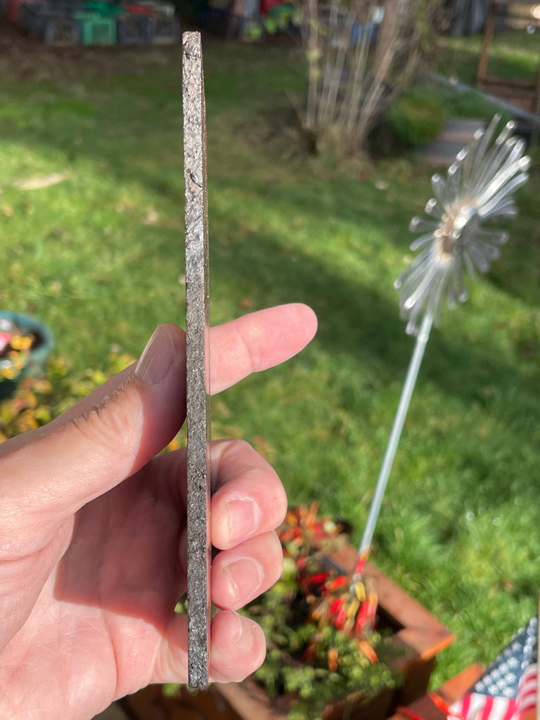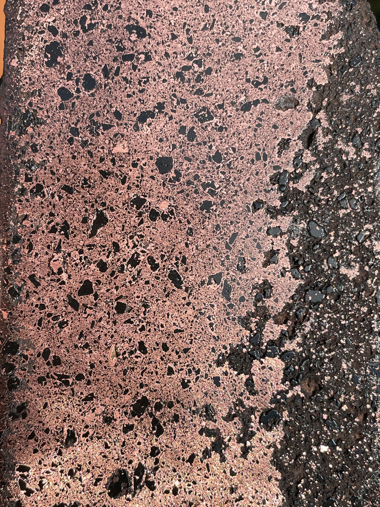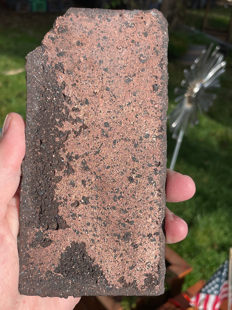 This is a slab of firebrick from the old smelters in Michigan measuring 6” long x 3” wide x 1/8” thick. The brick absorbed the metal during the smelting process and some were saved prior to being permanently buried after the decommissioning of the smelters. This is a rare piece of history and it is very suitable to be displayed as a part of history or cabbed into beautiful jewelry. These slabs are polished on one side and clear coated to keep it shiny. #FB3