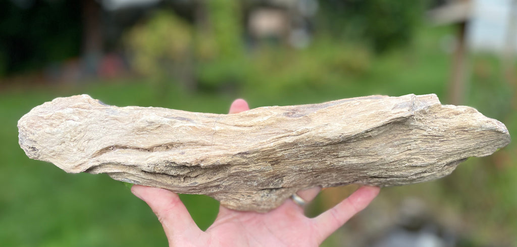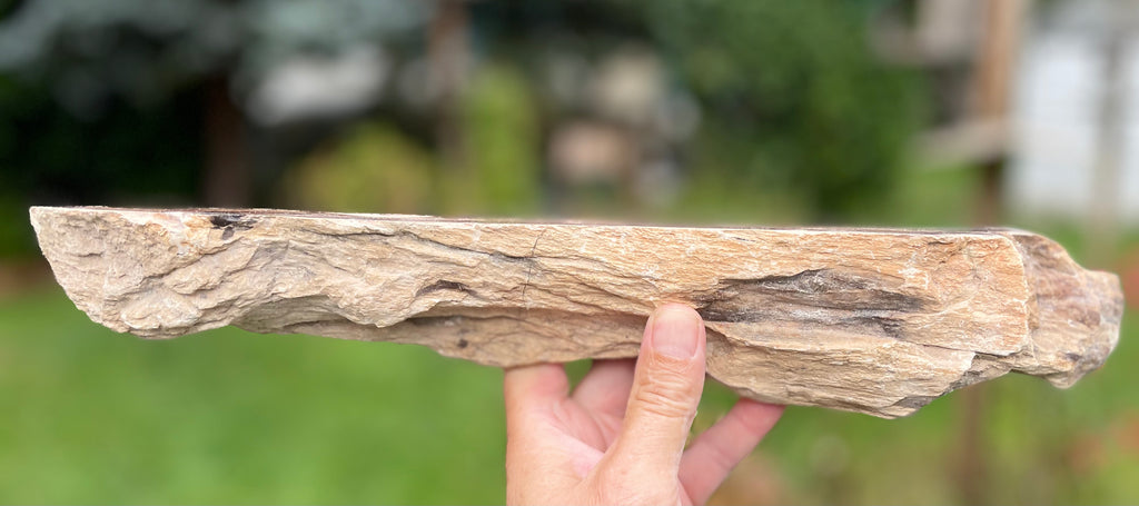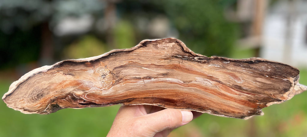 This large petrified wood specimen is from Oregon and had beautiful dark brown patterns of the wood it once was in this now fossil from long ago. The sides and back are natural with the front cut and polished. It weighs nearly 4 lbs and is approximately 14” long 3-1/3 “ wide and 3” deep.