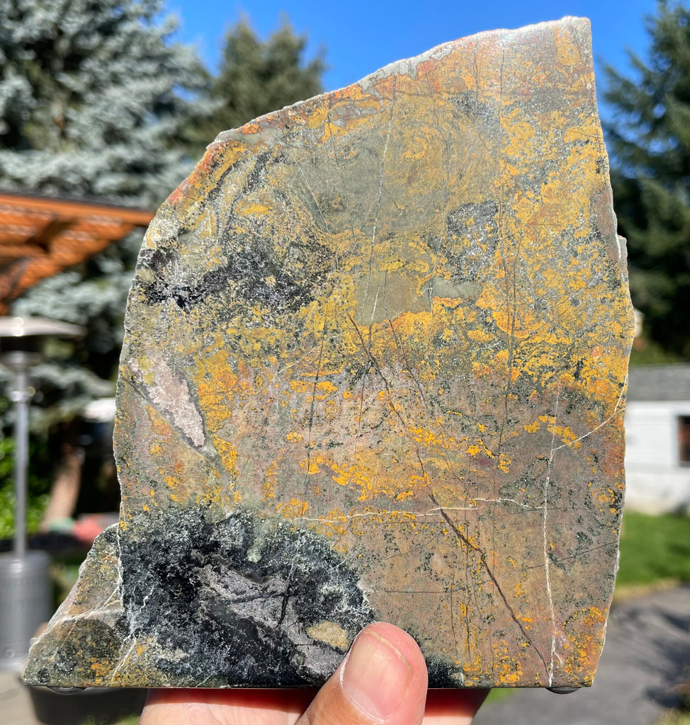 This pair of bookends I cut from Ocean Breeze Jasper found near Coos Bay, Oregon in a rock quarry. The material was too hard to run through their rock crushers so it was considered waste and Ocean Breeze Jasper was found! This comes in several colors with this piece being primarily yellow and dark blue.