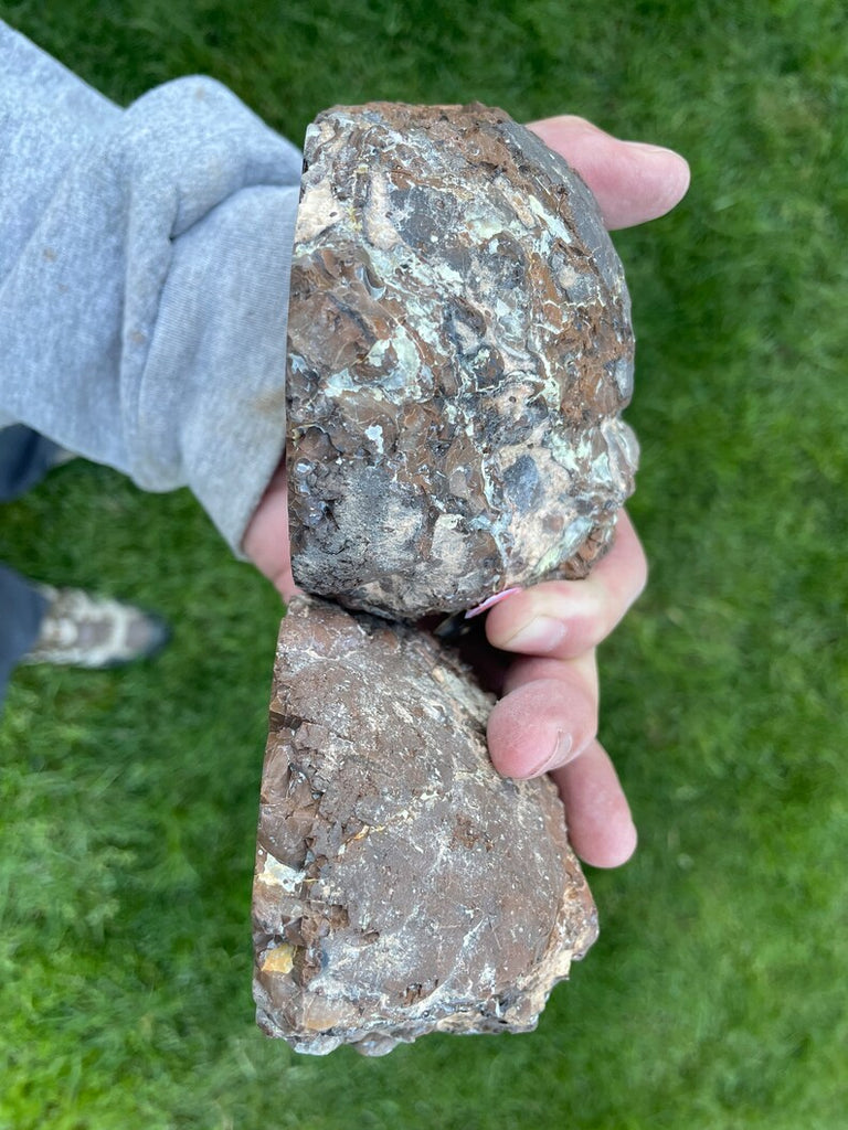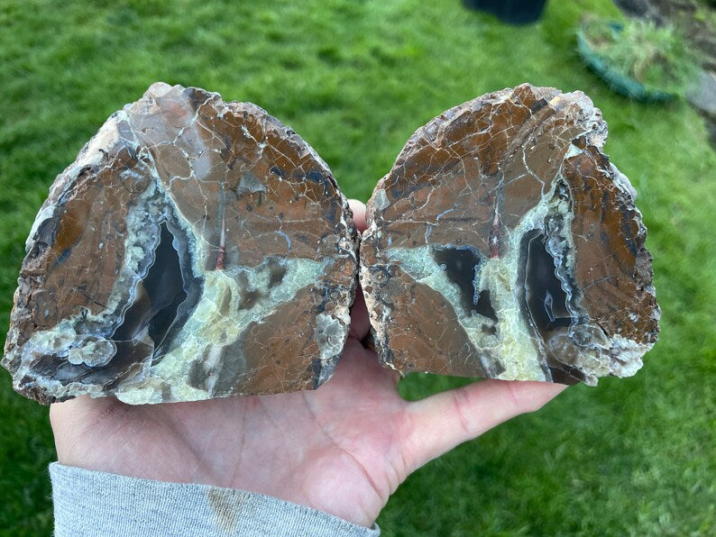 This is a thunder egg I dug from the Polka Dot mine in Central Oregon. I cut them in half and then flat on the bottom so they work well as small bookends or room accents. These have nice agate and opal inside and are fully polished. Together they weigh nearly 3 lbs.