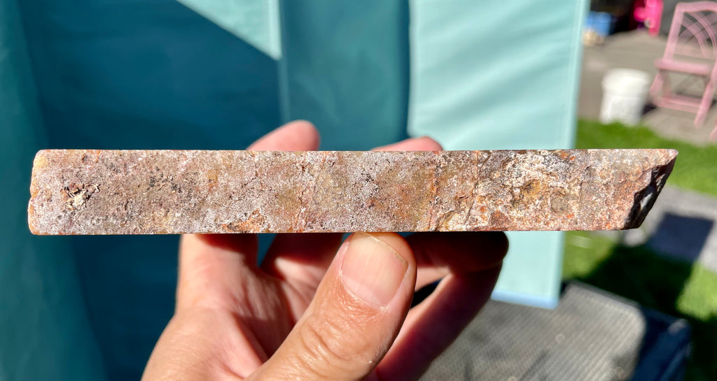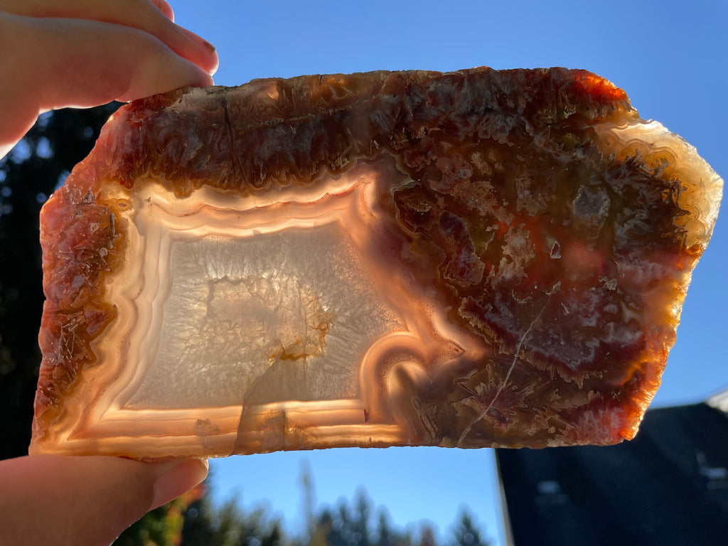This is a large slab of unique and beautiful agate from North Ankara, Turkey. I cut these thick at 3/8” thick so they are more durable than thin ones and easier to display. I have polished this on both sides and light does shine through it to show even more patterns if placed in a stand that lets backlight shine through.