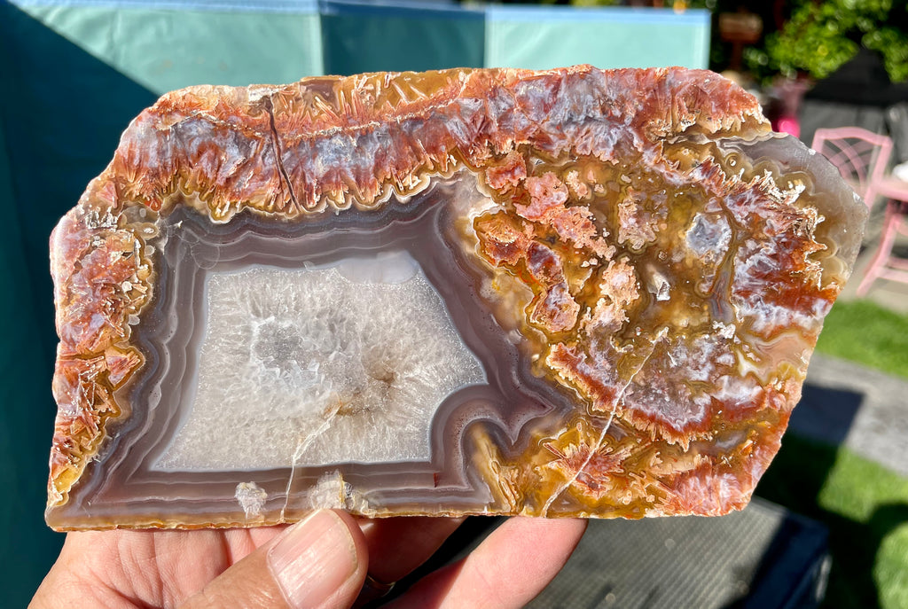 this is filled with a variety of agate formations including stick agate (pseudomorph), flower agate, banded agate and a solid crystal core in two separate chambers. The closer you look at this one the better it looks!  It weighs a whopping 1.2 lbs and is nearly 6” long and is 3” wide.
